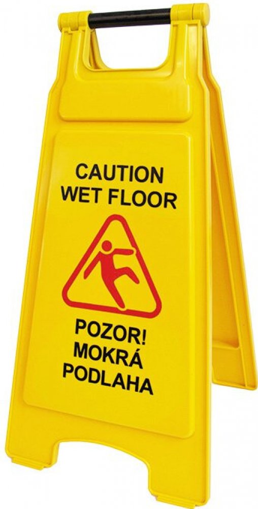 - výstražný plastový stojan s oboustranným nápisem "Pozor mokrá podlaha" v českém a anglickém jazyce, doplněný o mezinárodně známý symbol jako varování před možností uklouznutí na mokré / kluzké podlaze