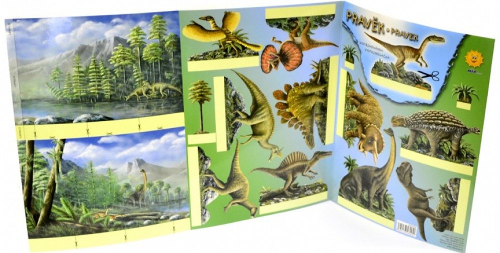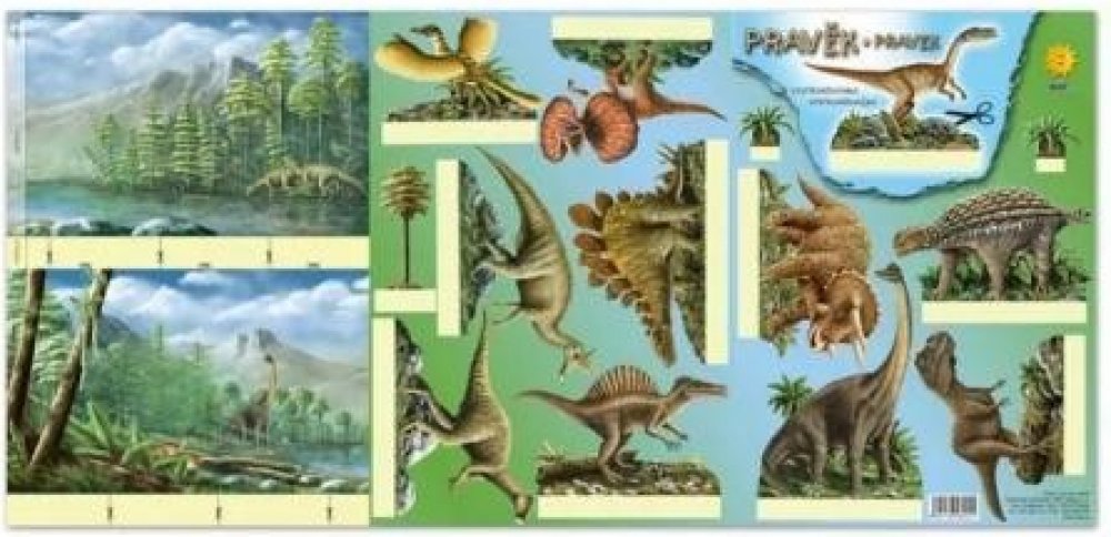 Vystřihovánky pravěk Vystřihovánky Pravěk. Zažijte spoustu zábavy s vystřihovánkou pro děti s tématikou dinosaurů a pravěku. Vystřihovánky Pravěk jsou na 3 listech formátu A4. Vystřihovánka se skládá z pozadí a 11 dinosaurů.Návod: Na označená místa použijte lepidlo a nůžky. Přerušované čáry znamenají záhyb.