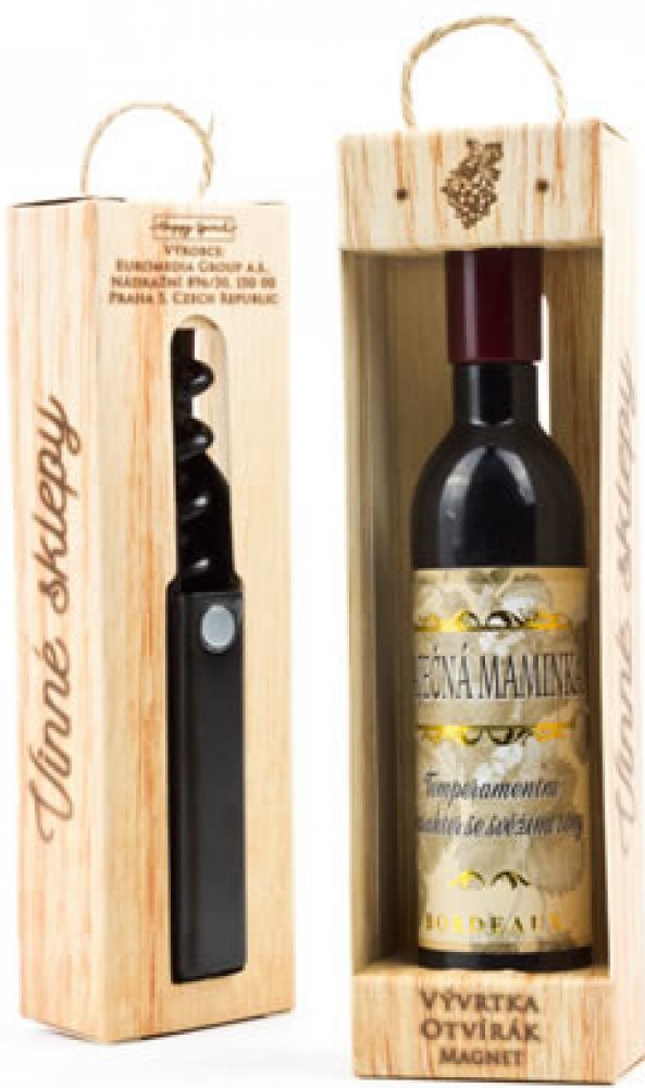 Vývrtka ve tvaru vinné lahve s originálním potiskem viněty je vhodným dárkem pro všechny milovníky vína. Užijte si svoji chvilku v dobré společnosti! Vývrtka s magnetem pro uchycení na lednici je balena v dárkové krabičce. Rozměr 12,5 x 3,5 x 2,5 cm.