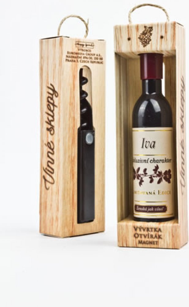 Vývrtka ve tvaru vinné lahve s originálním potiskem viněty je vhodným dárkem pro všechny milovníky vína. Užijte si svoji chvilku v dobré společnosti! Vývrtka s magnetem pro uchycení na lednici je balena v dárkové krabičce. Rozměr 12,5 x 3,5 x 2,5 cm.
