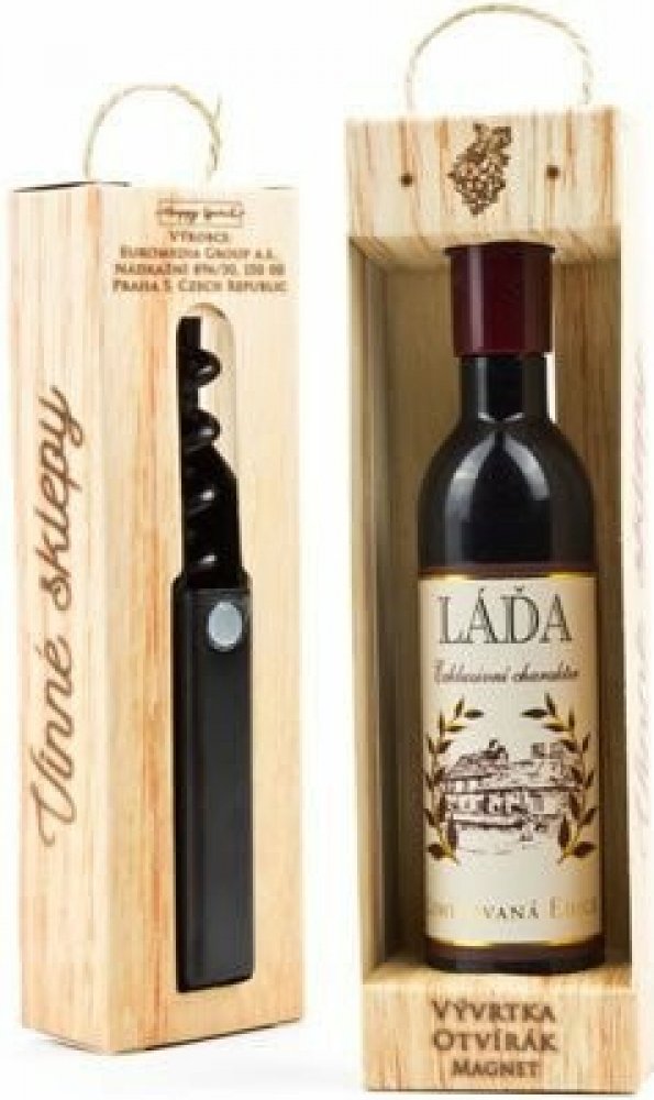 Vývrtka ve tvaru vinné lahve s originálním potiskem viněty je vhodným dárkem pro všechny milovníky vína.