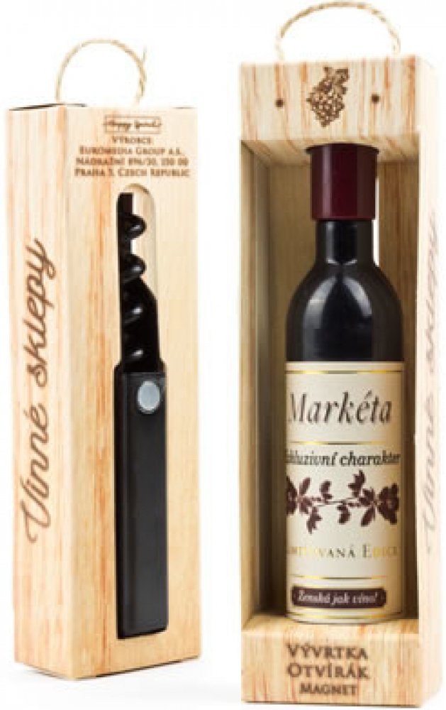 Vývrtka ve tvaru vinné lahve s originálním potiskem viněty je vhodným dárkem pro všechny milovníky vína. Užijte si svoji chvilku v dobré společnosti! Vývrtka s magnetem pro uchycení na lednici je balena v dárkové krabičce. Rozměr 12,5 x 3,5 x 2,5 cm.