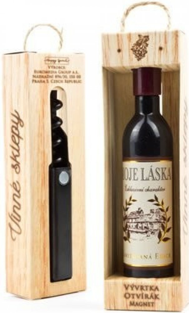 Vývrtka ve tvaru vinné lahve s originálním potiskem viněty je vhodným dárkem pro všechny milovníky vína. Užijte si svoji chvilku v dobré společnosti! Vývrtka s magnetem pro uchycení na lednici je balena v dárkové krabičce. Rozměr 12,5 x 3,5 x 2,5 cm.