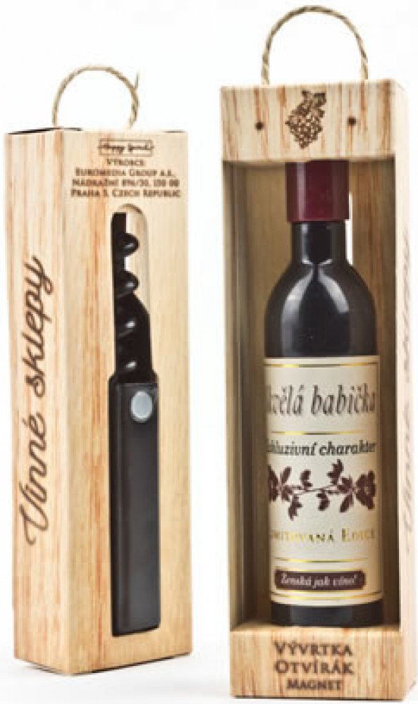 Vývrtka ve tvaru vinné lahve s originálním potiskem viněty je vhodným dárkem pro všechny milovníky vína. Užijte si svoji chvilku v dobré společnosti! Vývrtka s magnetem pro uchycení na lednici je balena v dárkové krabičce. Rozměr 12,5 x 3,5 x 2,5 cm.