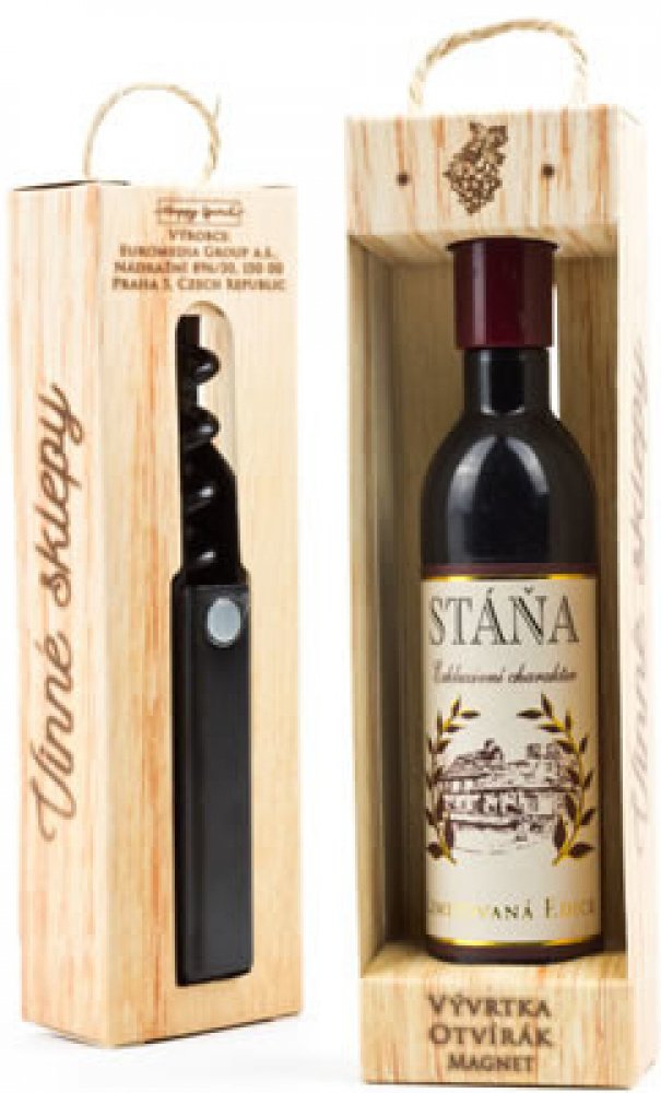 Vývrtka ve tvaru vinné lahve s originálním potiskem viněty je vhodným dárkem pro všechny milovníky vína. Užijte si svoji chvilku v dobré společnosti! Vývrtka s magnetem pro uchycení na lednici je balena v dárkové krabičce. Rozměr 12,5 x 3,5 x 2,5 cm.