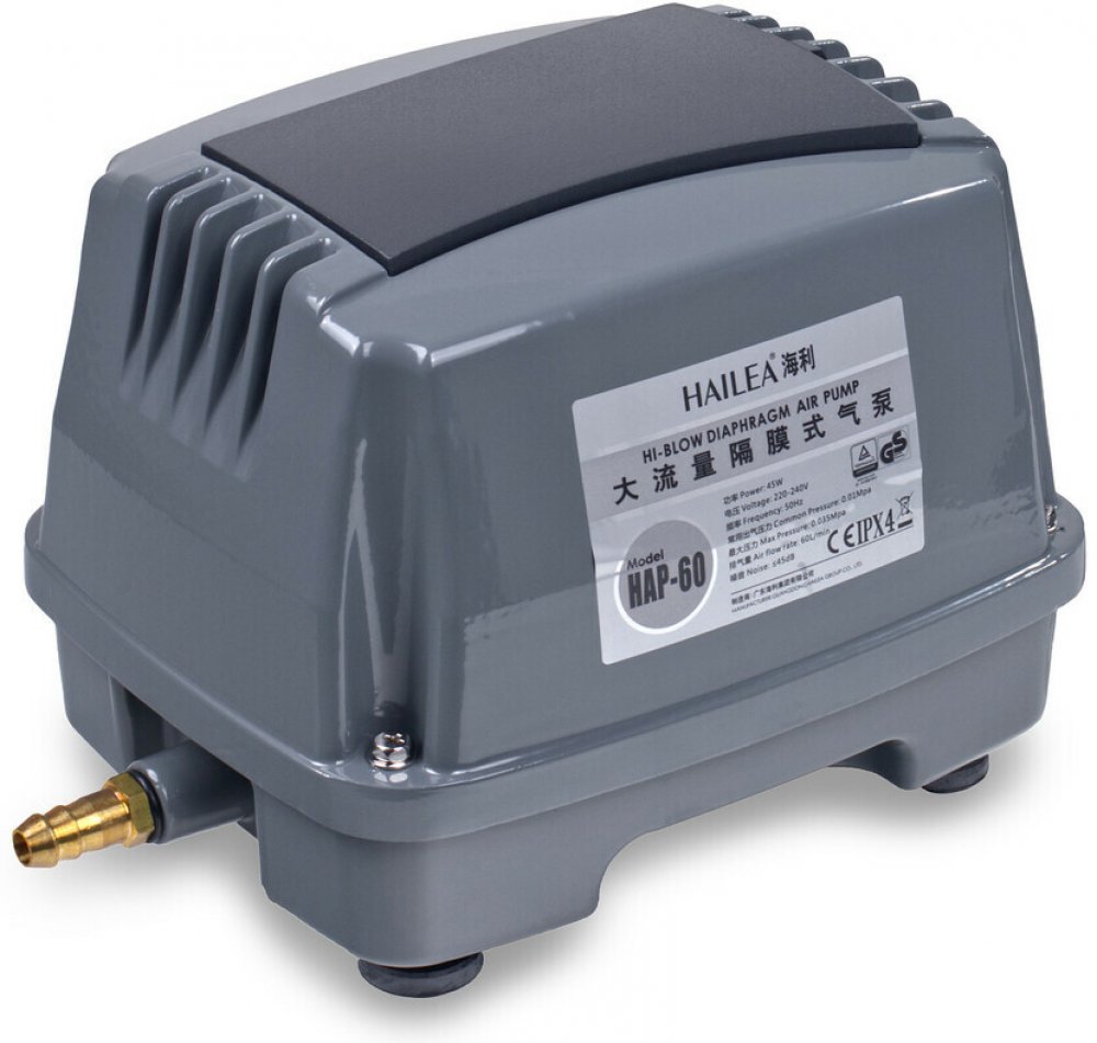 Hailea HAP-60 vzduchovací kompresor Robustní vzduchovací kompresor s hliníkovým tělem pro vnitřní i venkovní použití. vzduch je stlačován pomocí gumových membrán základní vývod na hadičku 9 mm a v příslušenství je plastový rozdělovač na 20 vývodů pro hadičku 4/6 mm vzduchovací kompresory Hailea jsou odolné vůči dešti, ne však vůči dlouhodobému působení vody Způsob použití a instalace: umístěte vzduchovací kompresor na pevné a suché místo mimo jezírko tak, abyste zabránili náhodnému pádu do vody, či jezírka doporučujeme kompresory chránit vzdušným krytem neumisťujte je do malých uzavřených prostor, či šachet s nedostatečným větráním vždy dbejte na dostatečný počet a průchodnost vzduchovacích kamenů a hadiček tak, aby nedocházelo k přehřívání kompresoru kompresor nebo vzduchovací hadice umisťujte nad úroveň hladiny vody tak, aby nemohlo dojít k zpětnému zaplavení kompresoru při přerušení dodávky el. proudu