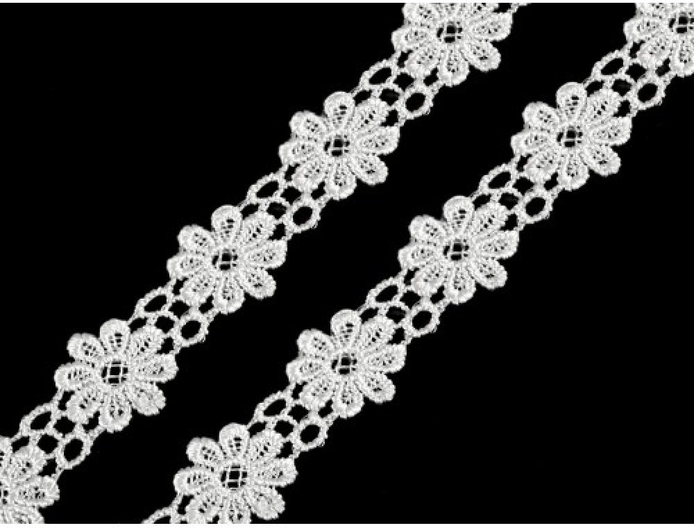 Vzdušnou krajku s květy využijete k olemování ubrusů, deček, k dekoraci šatů, sukní, halenek apod. br / Krajka může mít v návinu 1 prostřih. br / br / Vlivem technologických postupů (barvení, bělení, sušení) se může šíře krajek lišit o ±6 %. br / br / Šíře: 20 mm br / Cena je za jeden metr.