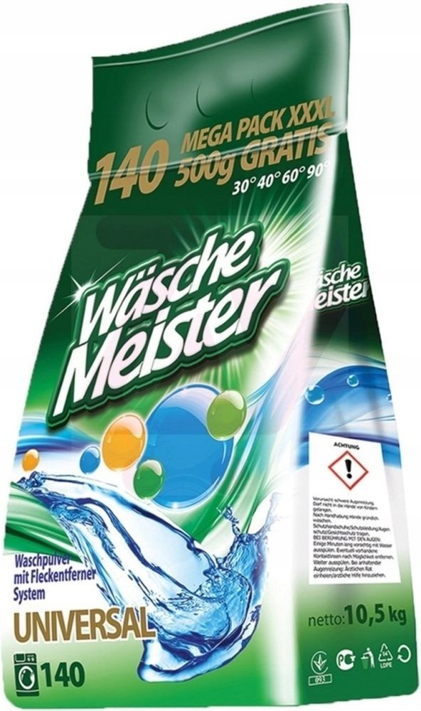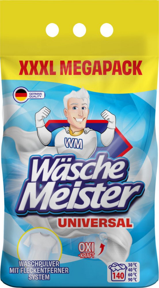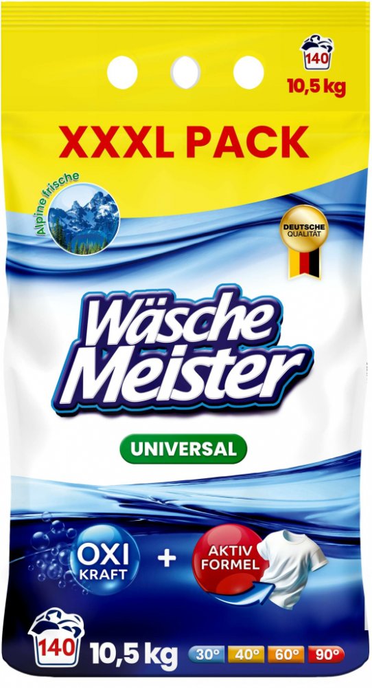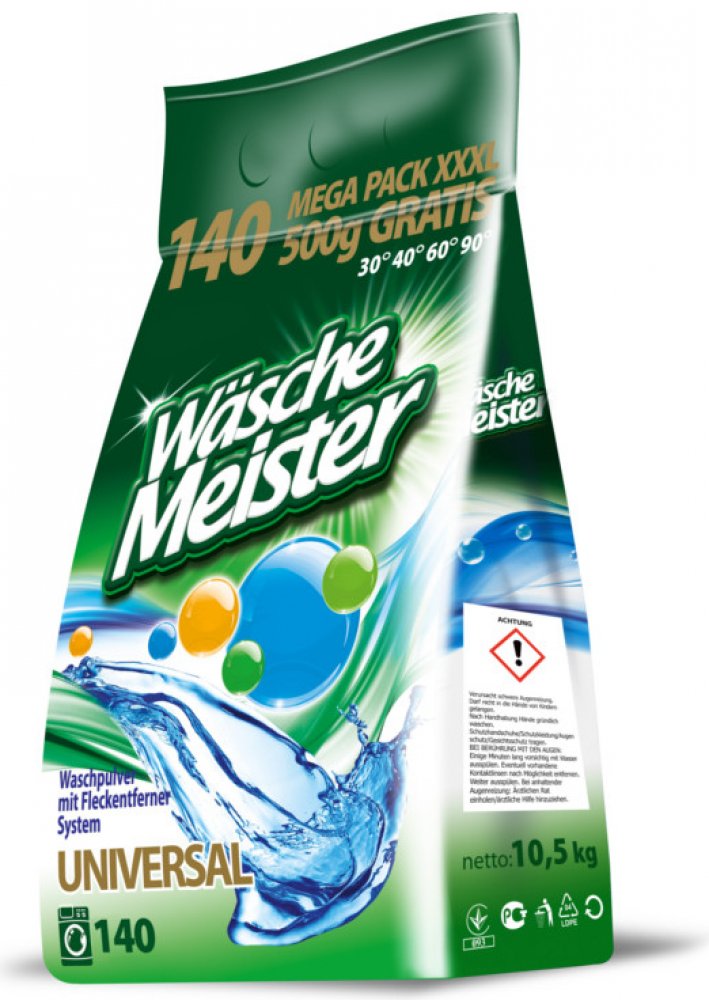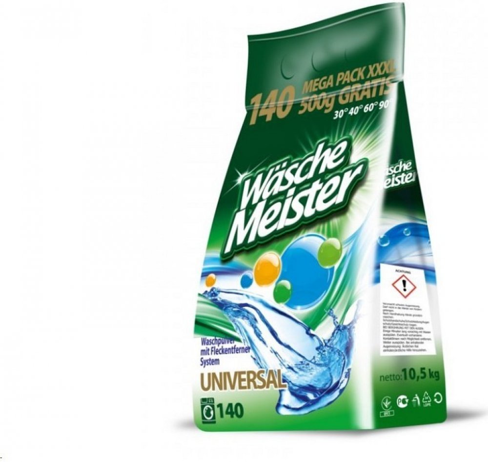 WÄSCHE MEISTER UNIVERSAL je univerzální prací prášek s novou vylepšenou recepturou, která zajišťuje ještě lepší prací výsledky. Tento prášek je navržen pro vysokou účinnost na bílé a stálobarevné prádlo a je ideální pro široké spektrum praní.