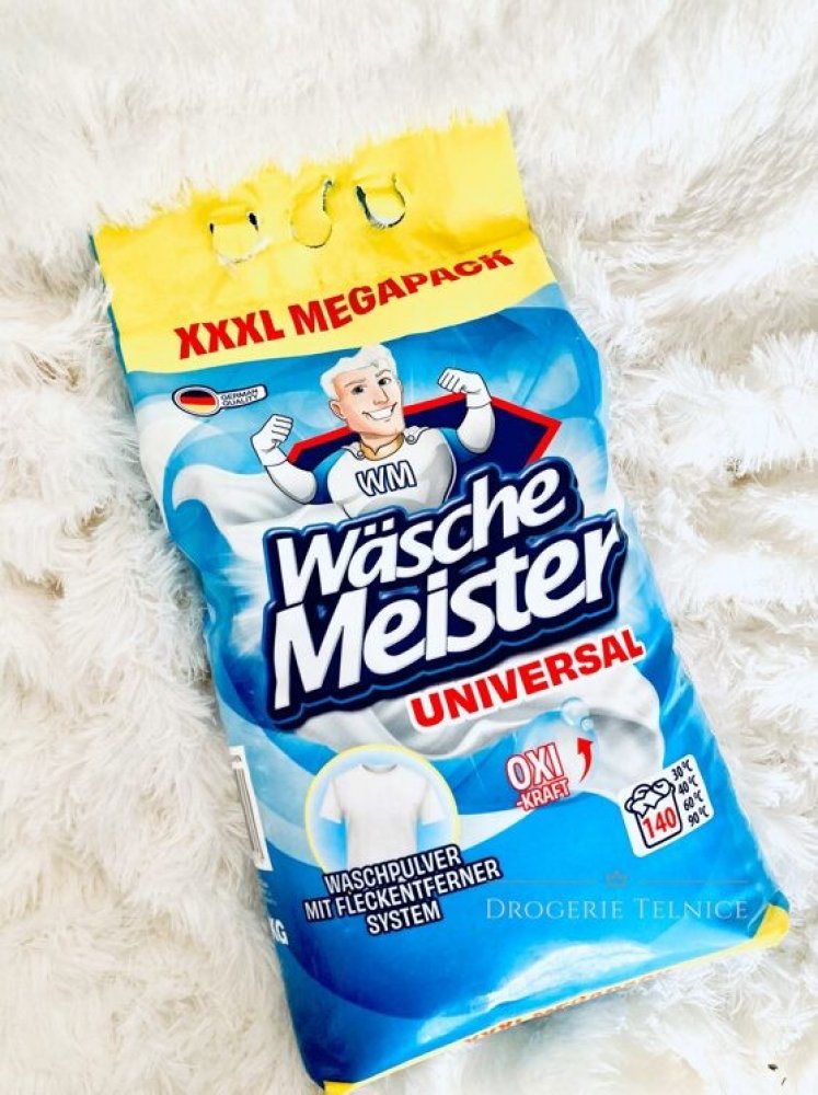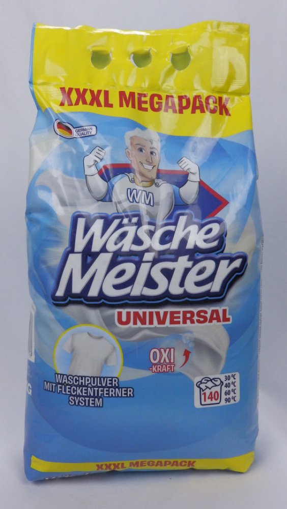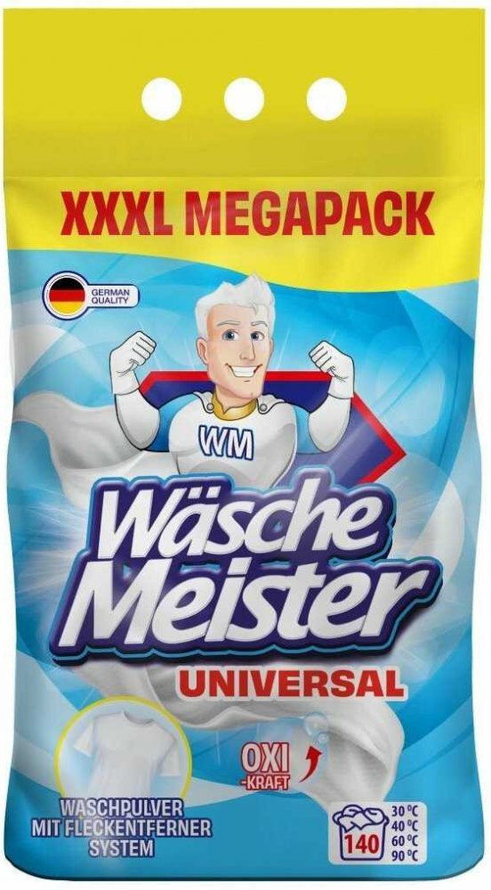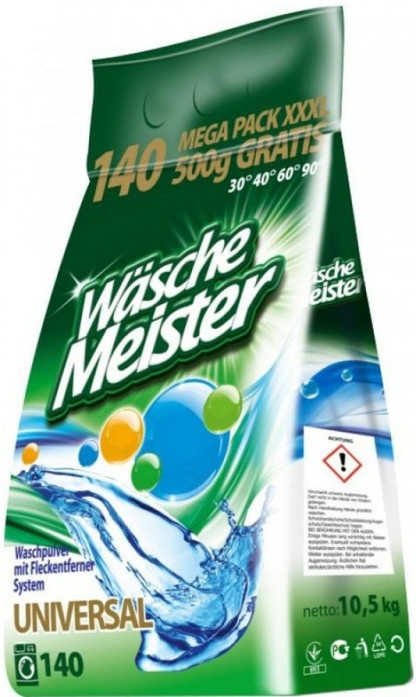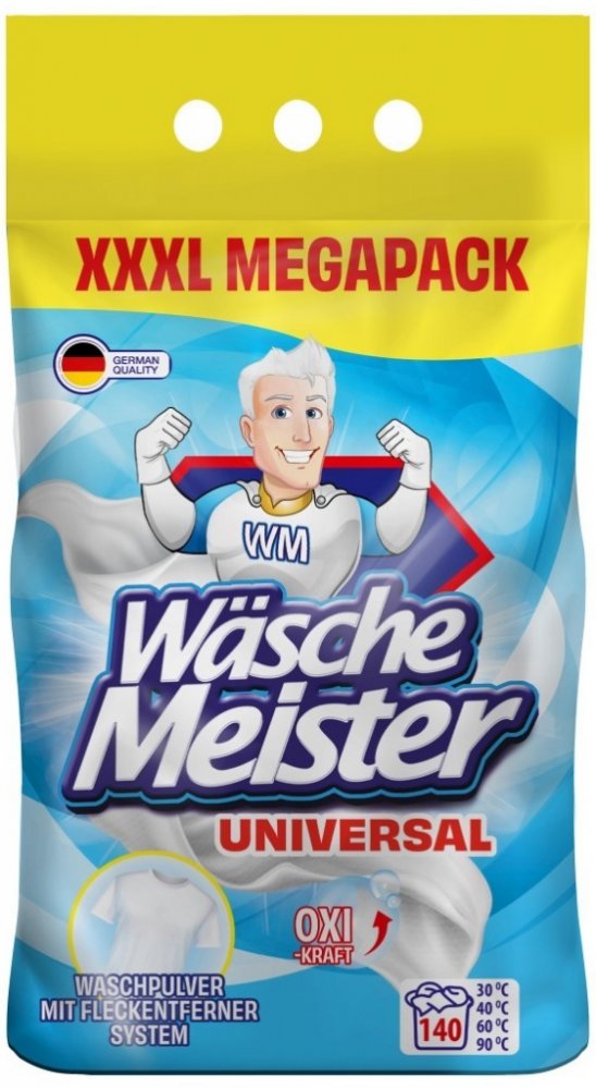 WÄSCHE MEISTER UNIVERSAL je univerzální prací prášek s novou vylepšenou recepturou, která zajišťuje ještě lepší prací výsledky. Tento prášek je navržen pro vysokou účinnost na bílé a stálobarevné prádlo a je ideální pro široké spektrum praní.