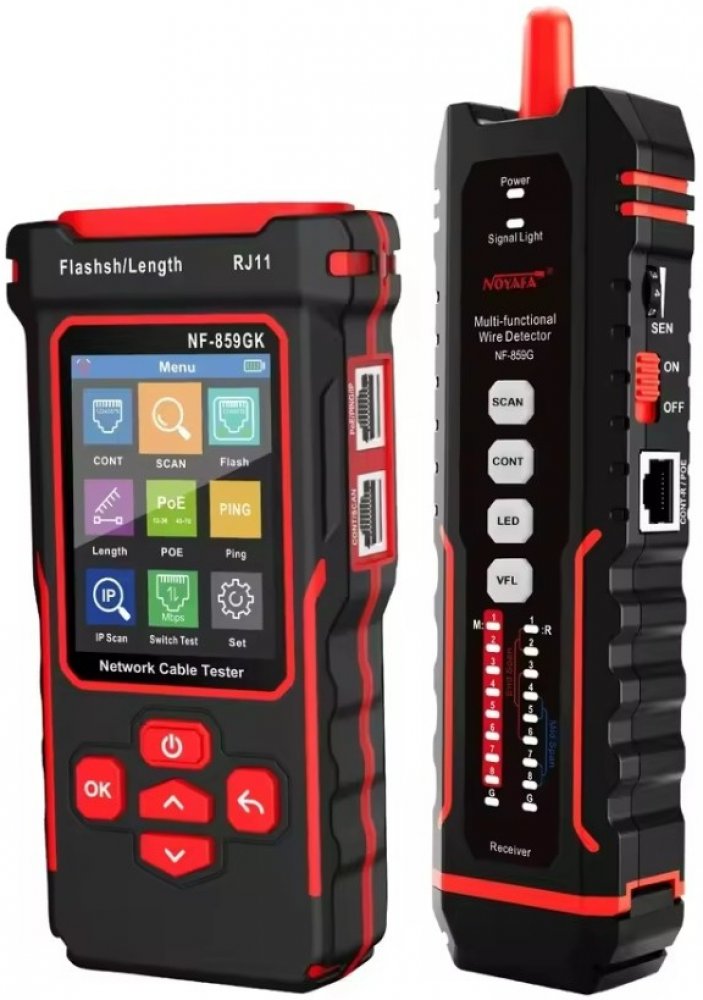 Profesionální síťový tester NF859GK 4v1 s funkcemi pro měření délky kabelu, PoE, PING, IP scan a integrovaným VFL 10 mW pro optická vlákna. Ideální nástroj pro instalace a údržbu datových sítí. Technické parametry: Režim detekce vodičů: Digitální / Analogový (Anti-interference / Ordinary) Auto OFF / Upozornění na nízké napětí: Ano Test kontinuity: Remote a Switch Měření délky kabelu: 5 - 200 m (±3...