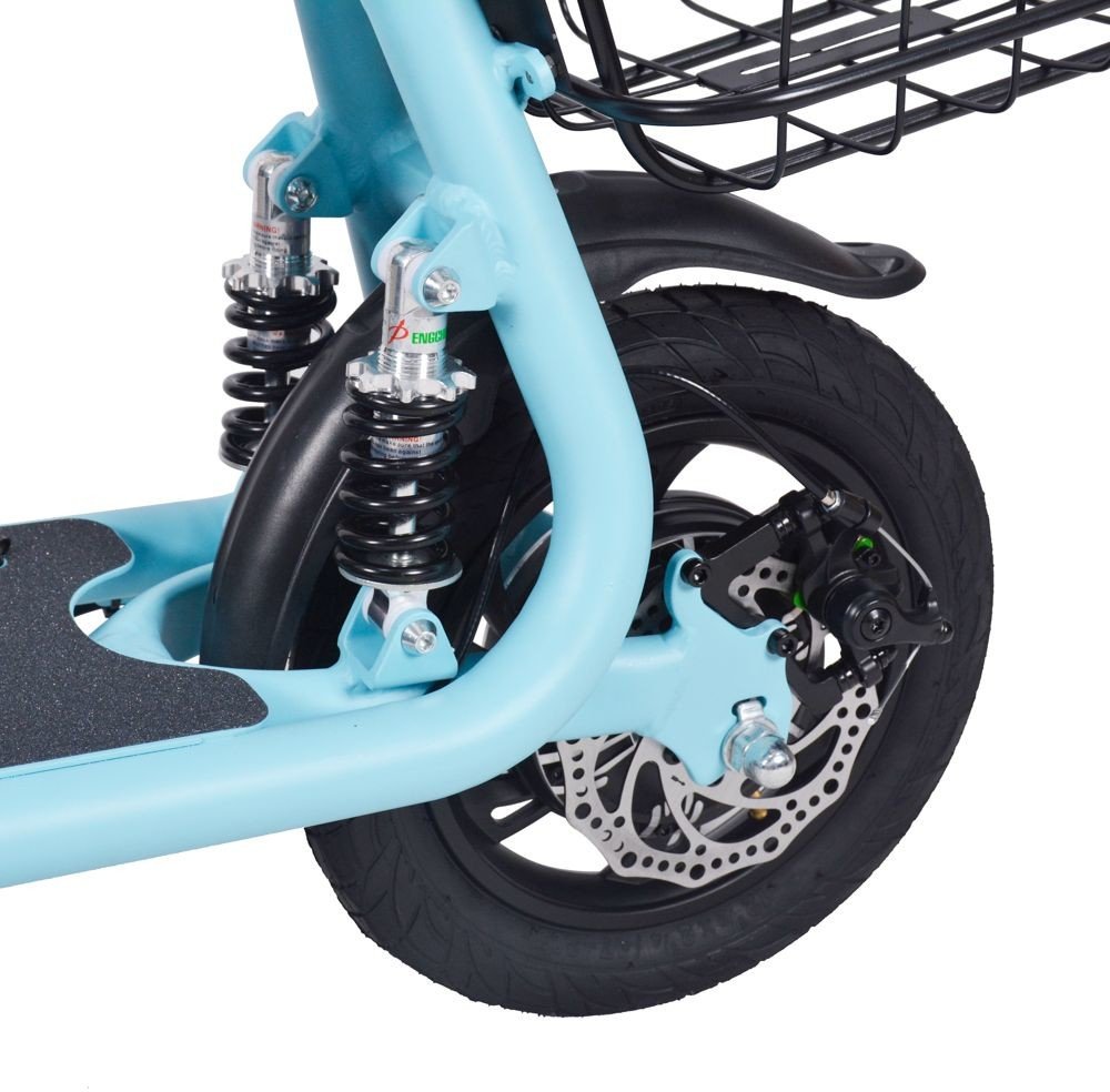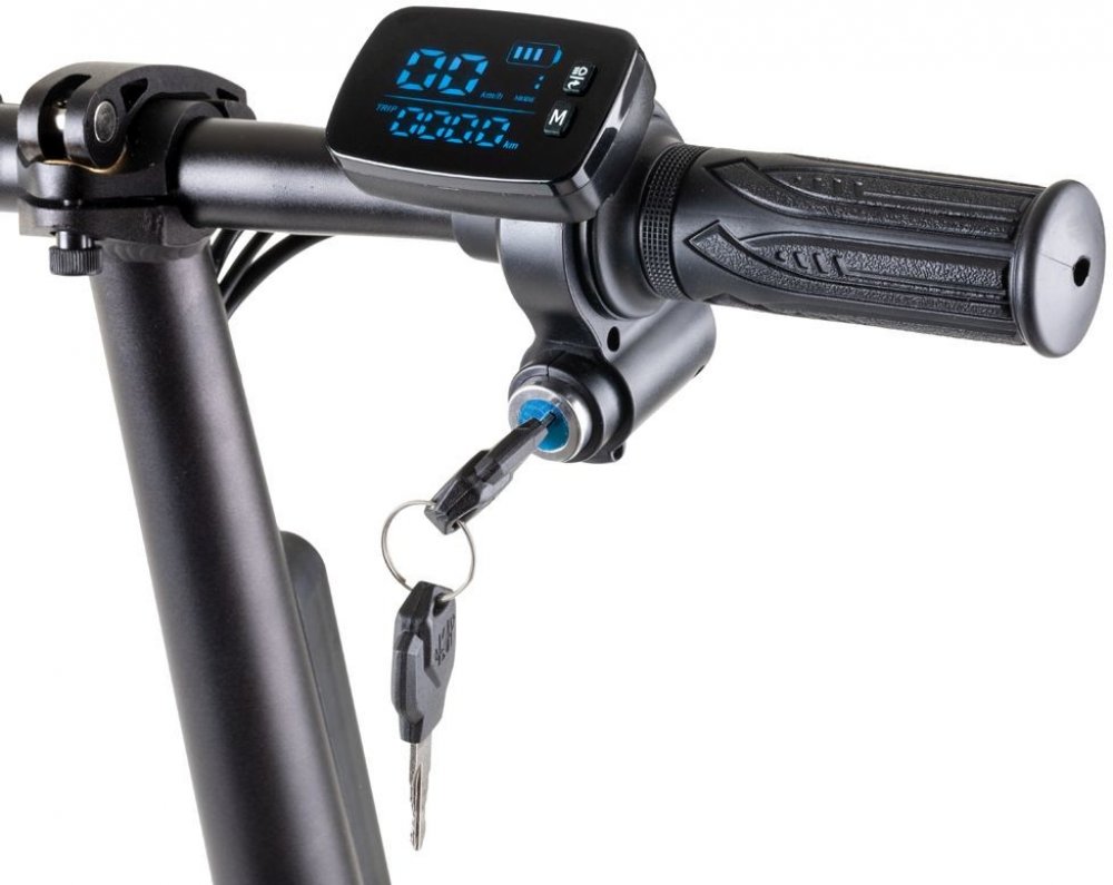 Parádní vychytávkou je také zámek na klíč. Při kratší pauze stačí koloběžku klíčem uzamknout, ta je imobilizována (nelze ji zapnout) a vy tak nemusíte s sebou navíc tahat těžký zámek. Ve výbavě nechybí ani stojánek - pro chvíle, kdy koloběžku zrovna nepoužíváte. Za zhoršených světelných podmínek vaší viditelnost podpoří přední a zadní světlo. Díky přítomnosti košíku v zadní části stroje je ideální také na nákupy a převážení drobnějších věcí (až do hmotnosti 10 kg). V případě, že dojde "šťáva" 10,2 Ah baterii, kterou je koloběžka vybavena a která nabízí dojezd až 30 kilometrů, není problém nouzově dojet na místo určení vlastní silou, odstrkáváním, případně koloběžku vést. Motor je v tu chvíli odpojen a neklade žádný odpor.