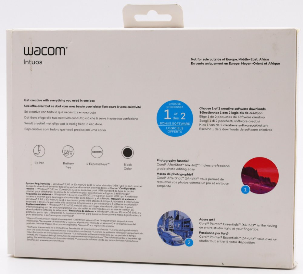 Oproti předchozím verzím Intuos se Wacom rozhodl nechat volbu softwaru na zákazníkovi až během registrace. U tohoto základního modelu si můžete vybrat jeden z následujících verzí software: