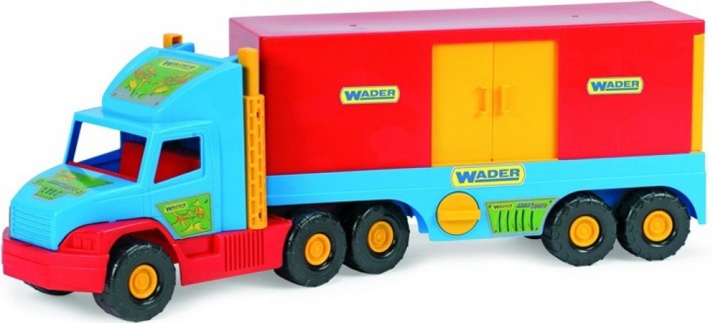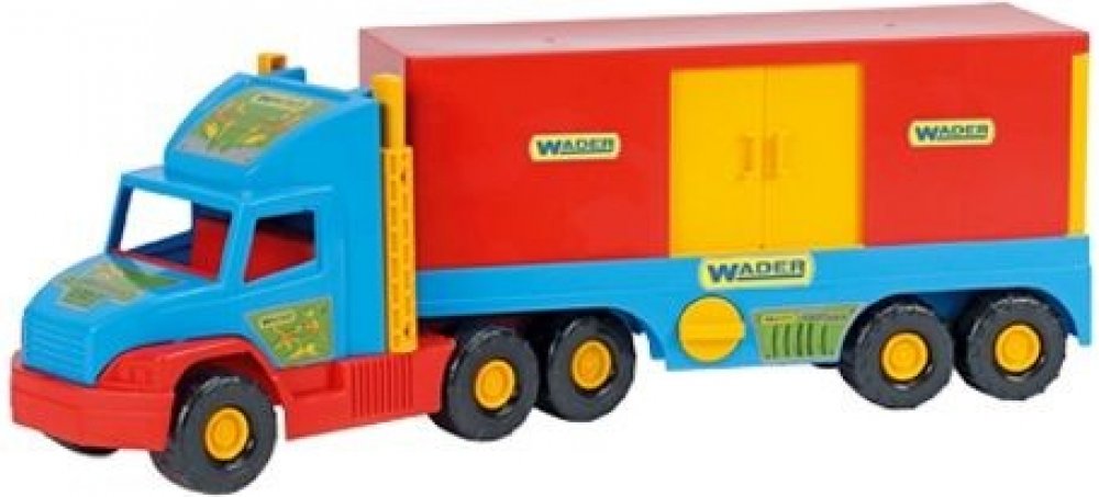 Velký barevný tahač s kontejnerem. Kontejner lze otevírat z boku i ze zadu a nakládat do něj náklad.