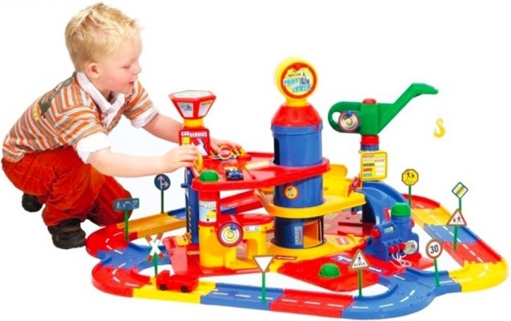 Velké 3 patrové parkoviště s dráhou a 2 auty. Obsahuje mnoho