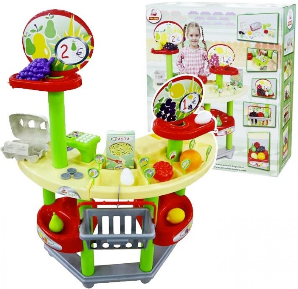 Smoby supermarket s elektronickou pokladnou s LCD displejem, s integrovanou kalkulačkou, se skenerem s funkcí zvukového signálu a světla, nastavitelnými hodinami a spoustou příslušenství.