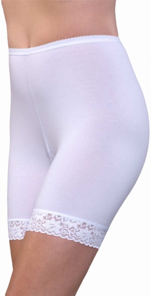 Nohavičkové kalhotky Wadima 100207 zabraňují nepříjemnému tření v oblasti stehen. Jsou ideální pod šaty i sukně. Kalhotky mají delší nohavičky a vysoký pas pro dostatečnou podporu a zakrytí oblasti břicha. Jsou vyrobeny ze směsi 94 % bavlny a 6 % elastanu, což zajišťuje pohodlí a pružnost. Na koncích nohaviček je 4 cm široký krajkový lem, který dodává kalhotkám na eleganci. Bezešvý design v oblasti boků a stehen zajišťuje hladký vzhled pod oblečením.