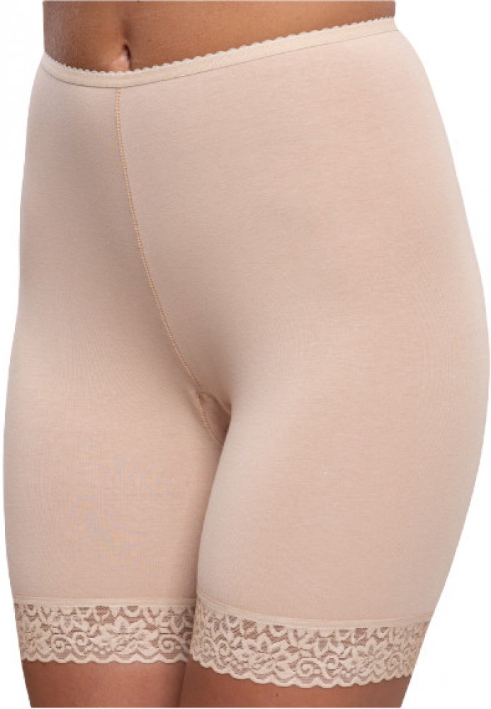 Nohavičkové kalhotky Wadima 100207 zabraňují nepříjemnému tření v oblasti stehen. Jsou ideální pod šaty i sukně. Kalhotky mají delší nohavičky a vysoký pas pro dostatečnou podporu a zakrytí oblasti břicha. Jsou vyrobeny ze směsi 94 % bavlny a 6 % elastanu, což zajišťuje pohodlí a pružnost. Na koncích nohaviček je 4 cm široký krajkový lem, který dodává kalhotkám na eleganci. Bezešvý design v oblasti boků a stehen zajišťuje hladký vzhled pod oblečením.