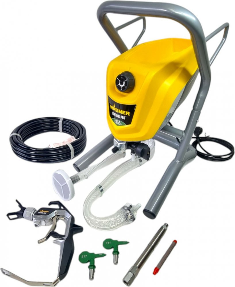 Balení obsahuje základní přístroj Control Pro 250M, pistole Control Pro Airless, 9m hadice Airless, trysky: 311 HEA pro řídké a 517 HEA pro husté materiály, návod k obsluze a HEA Filter kit.