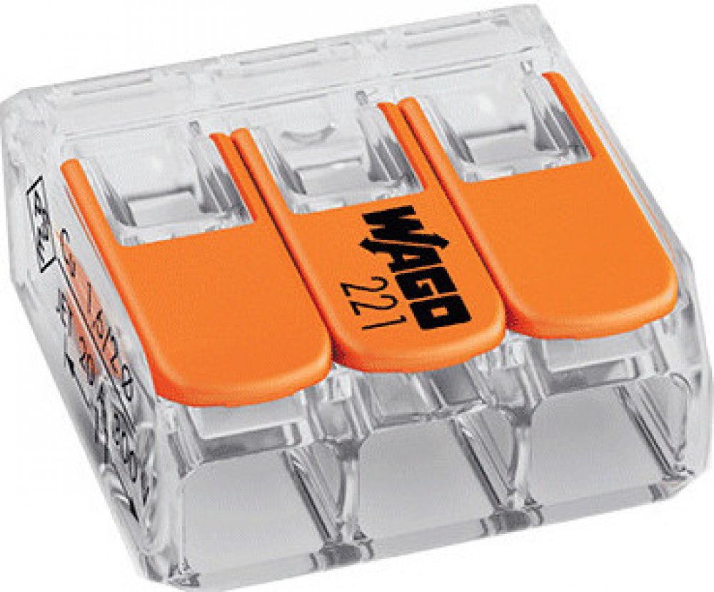 Svorka WAGO 221-413 je speciálně navržena pro připojení až tří vodičů nebo lanka o průřezu od 0,14 mm² do 4 mm². Tento model je ideální pro elektroinstalace, kde je potřeba propojit více vodičů najednou, zejména pokud jde o flexibilní vodiče (lanka). Je vybavena bezšroubovým, tlačítkovým mechanismem, což umožňuje rychlou a bezpečnou instalaci.