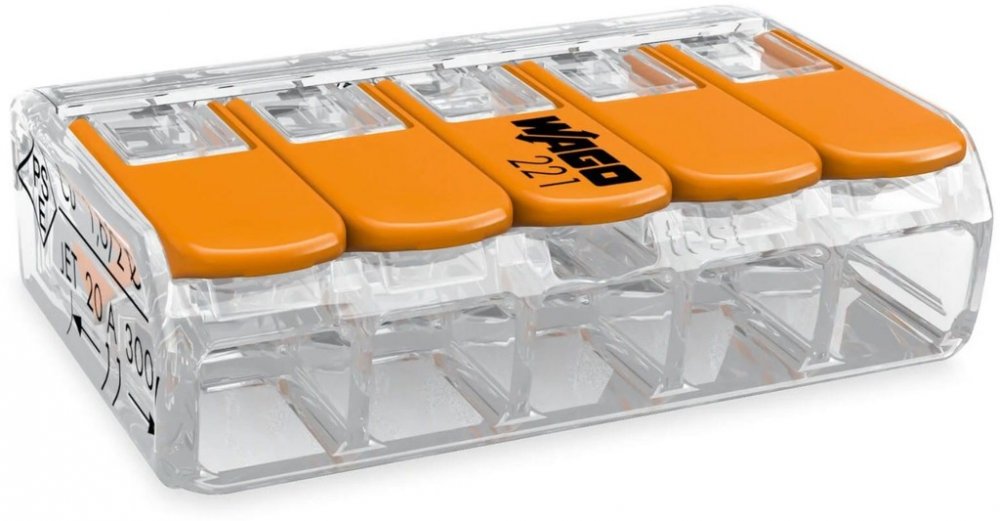 Svorka WAGO 221-415 je bezšroubová elektroinstalační svorka určená pro připojení až pěti vodičů nebo lanka o průřezu od 0,14 mm² do 4 mm². Tento model je ideální pro situace, kde je potřeba propojit více než tři vodiče, což je časté v rozvaděčích, distribučních panelech nebo složitějších elektroinstalačních aplikacích. Svorka je vybavena jednoduchým a rychlým tlačítkovým mechanismem pro snadnou instalaci bez použití nástrojů.