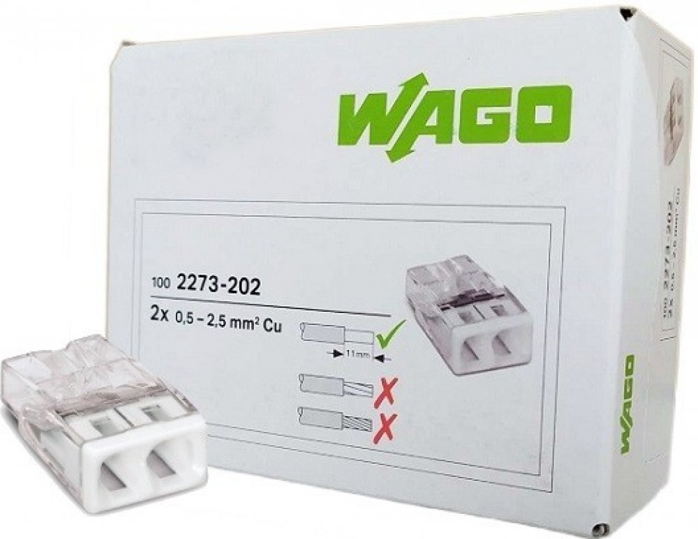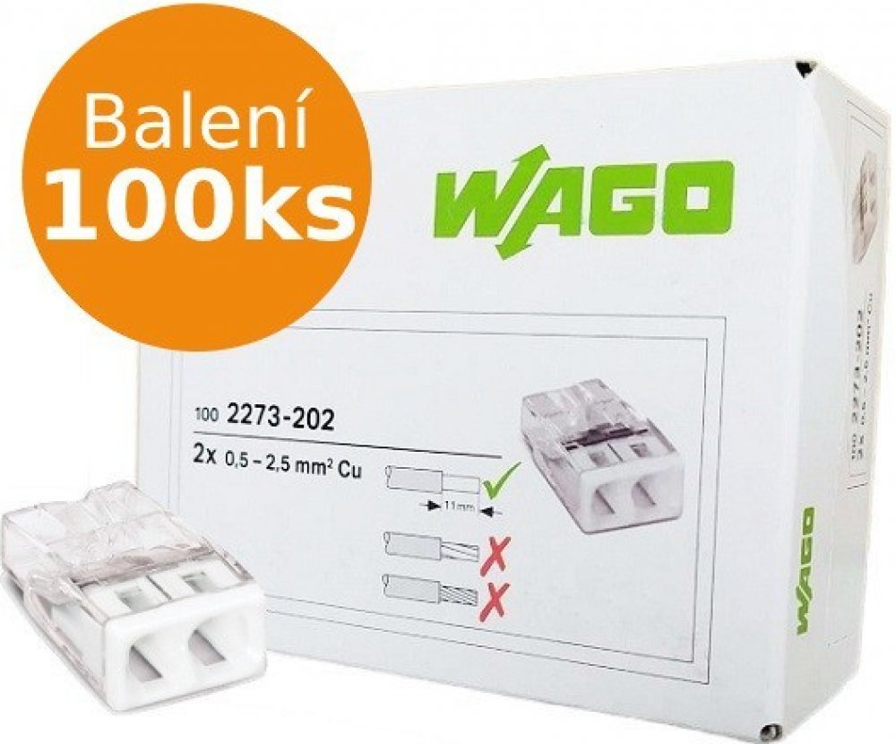 WAGO svorky balení 100ks typ 2273-202 MINI za zvýhodněnou cenu. WAGO svorka průhledná je určená pro připojení vodičů o průřezu 0.5 - 2,5 mm² jako bezšroubové spojení vodiče. Průhled v krytu slouží pro kontrolu izolace s testovacím otvorem pro všechny běžné zkoušečky.