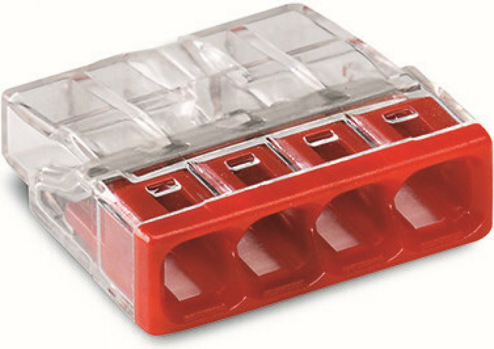 Spojovací krabicová svorka COMPACT. Pro plné vodiče. Max. 2,5 mm² 4 vodiče. Barva pouzdra transparentní. Barva krytu červená. Okolní teplota: max. 60 °C (T60).