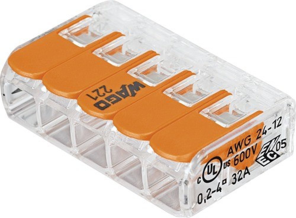 Transparentní oranžovou WAGO svorku ze série 221 můžete využít se všemi běžnými druhy vodičů. Bez problému tak lze propojit vodiče s průřezem od 0,14 do 4 mm2 (lankové) nebo 0,2 až 4 mm2 (jednožílové i vícežílové). Jmenovitý proud 32 A a napětí 450 V zaručí využitelnost této svorky pro širokou škálu aplikací, například s ní tak připojíte svítidla, domovní telefony, ovládání dveří, vrat či motorky ...