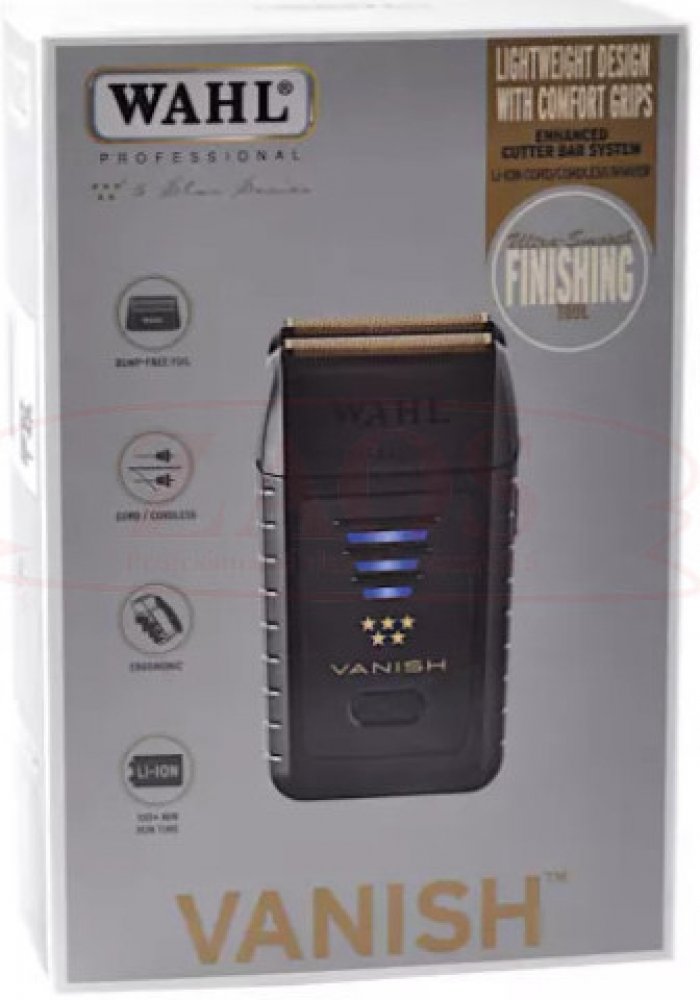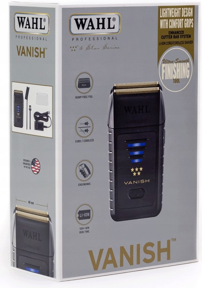 Profesionální a výkonný holicí strojek WAHL 08173-716 Vanish. Strojek na vousy a na dokončovací kadeřnické práce s ultratenkou a odolnou planžetou, která zaručuje precizní oholení. Hypoalergenní zlatá fólie - zajišťuje vynikající vyholení. Dva odpružené lamelové nože umožňují efektivní oholení a spolehlivě zvládají i jemné chloupky. Vysokorychlostní DC motor s rychlostí 9.000 ot/min pro efektivní výkon. Akumulátorový a kabelový provoz umožňuje flexibilitu při používání. Na jedno nabití vydrží až 100 minut. Rychlé nabíjení, nabití za přibližně 50 minut. Výhodou je cestovní funkce Travel Lock, která zabraňuje náhodnému zapnutí strojku během přepravy. Ergonomický tvar zajistí pohodlné používání.