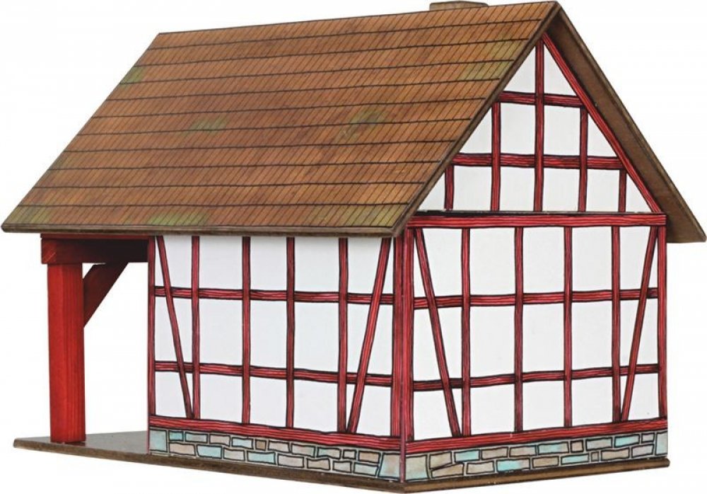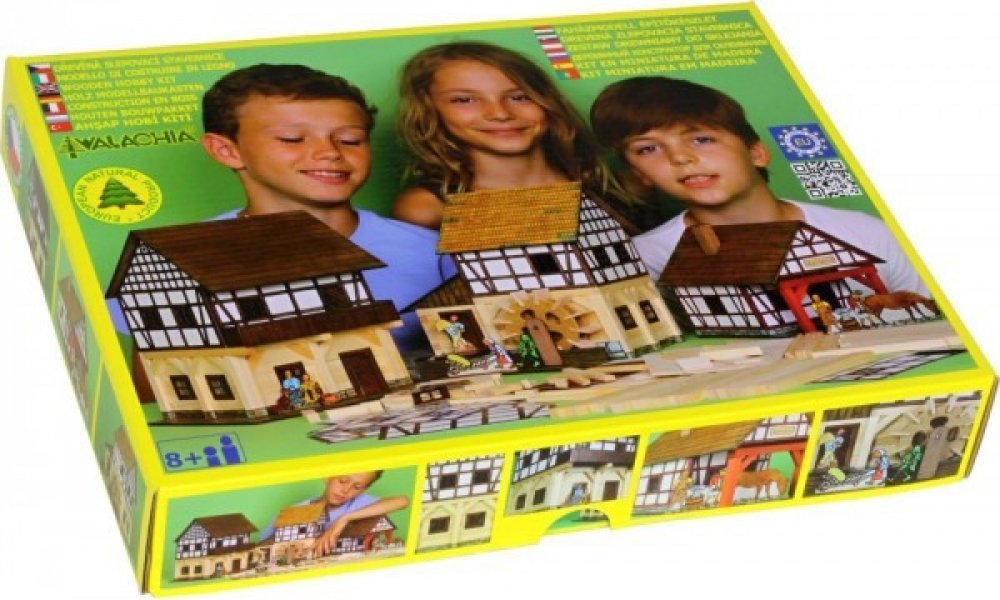 Dřevěná slepovací stavebnice obsahuje dřevěné hranolky daných délek ke stavbě roubených stěn, díly na střechy a štíty, kartonové výseky oken a dveří i předtištěné papírové potisky. Součástí stavebnice je schematický montážní plán.