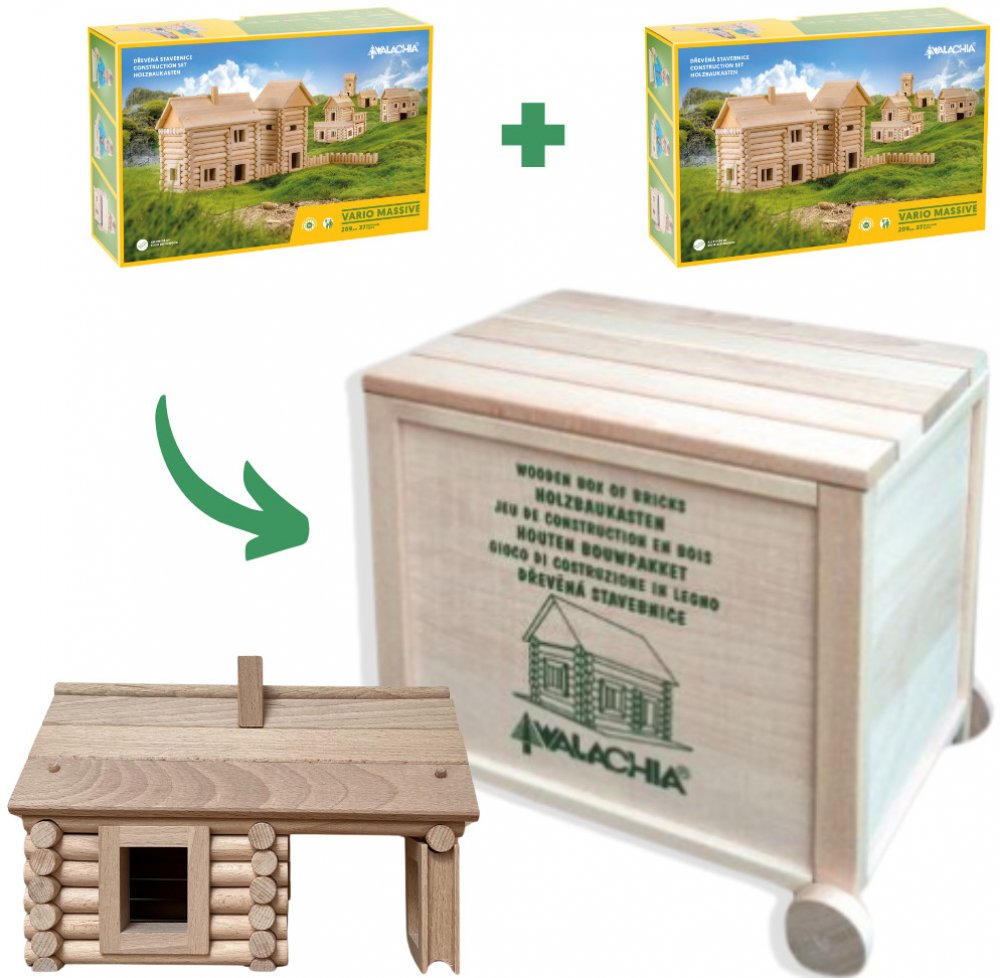 Skládací dřevěná stavebnice VARIO v dřevěné bedně. Obsahuje dvě stavebnici VARIO MASSIVE 209 dílů bez kartónových krabic, celkem 418 dílů.