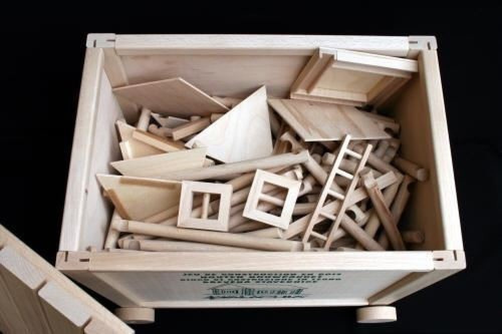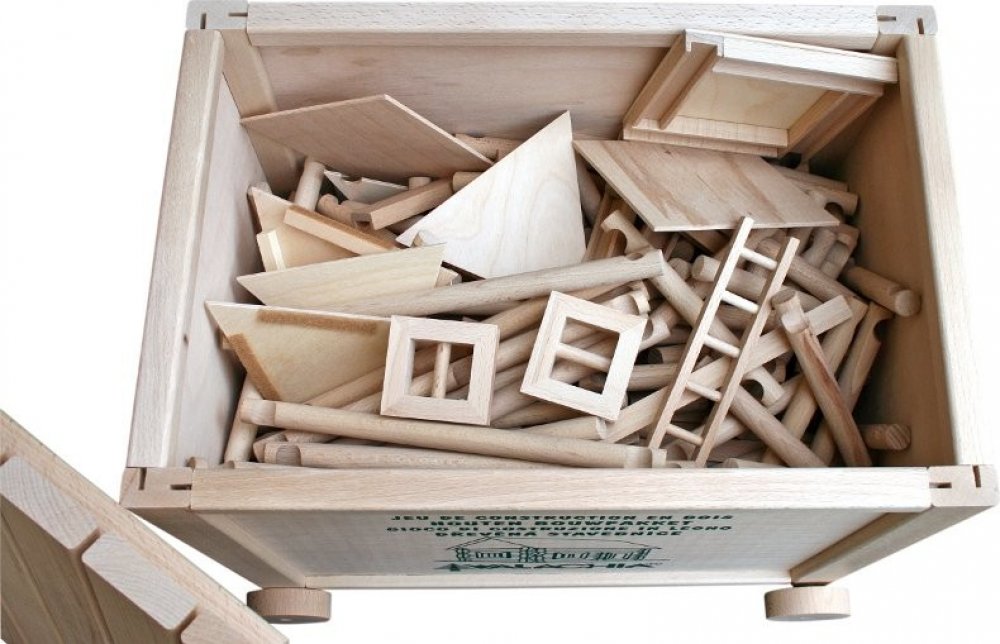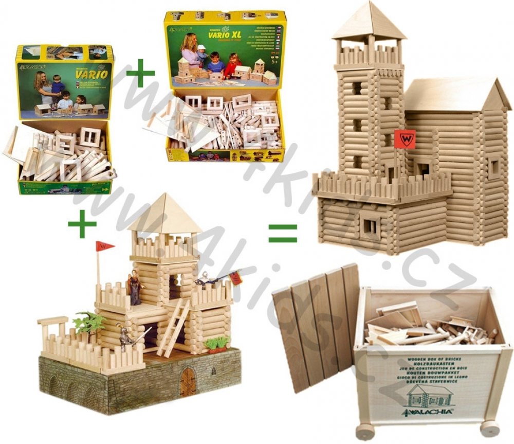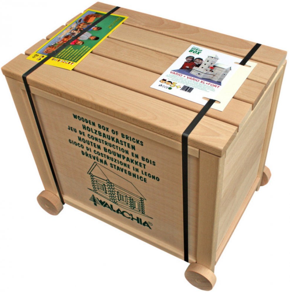 Skládací dřevěná stavebnice VARIO v dřevěné bedně. Obsahuje stavebnici VARIO 72 dílů, VARIO XL 184 dílů a VARIO FORT 194 dílů bez kartónových krabic, celkem 450 dílů.