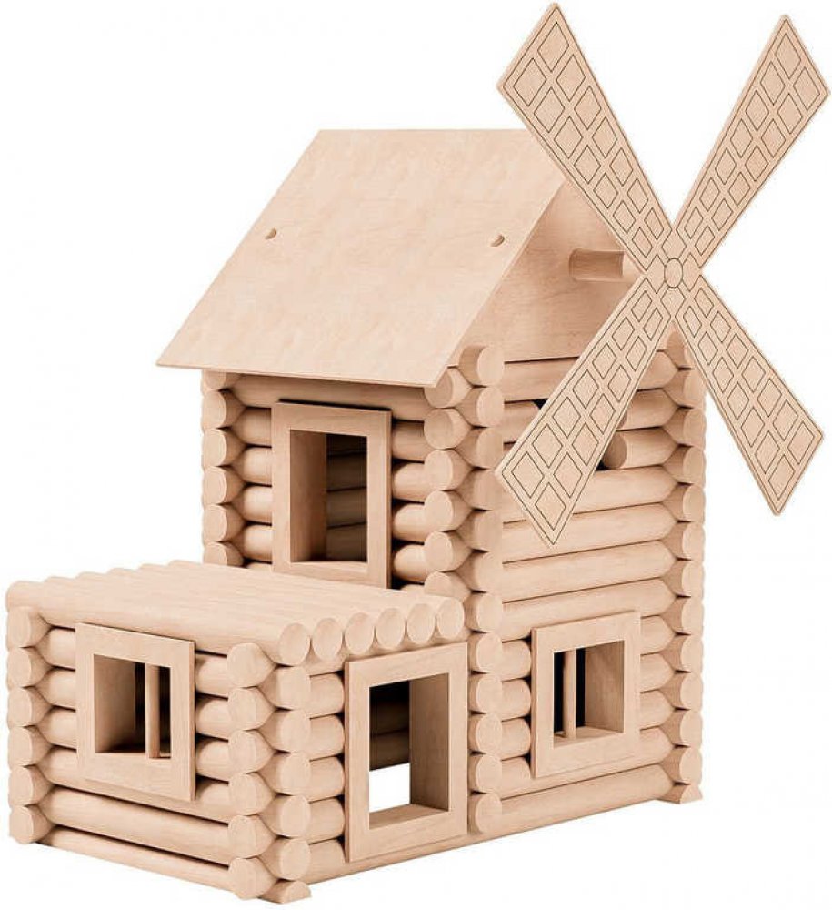 Užijete si stavění z pečlivě dohlazených bukových kulatin o průměru 15 mm, v délkách od 28 do 250 mm, které jsou opatřené frézovanými půlkulatými zámky. Okna a dveře, slepené z masivních profilů, se vkládají do stěn staveb.