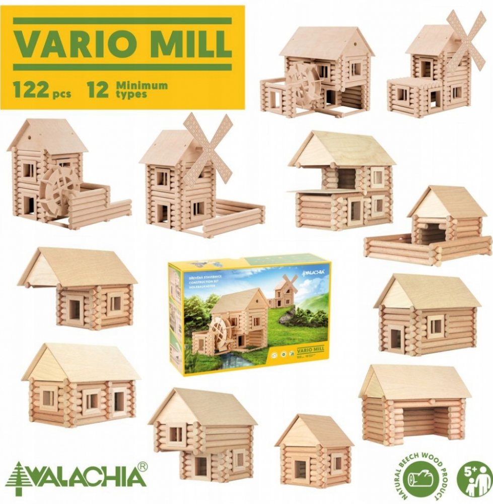 Stavebnice Vario jsou mezi sebou kompatibilní a krásně se doplňují. Koupí jiné verze rozšíříte možnosti staveb. Pouze ve verzích Vario massive najdete masivní střechu, zatímco v ostatních stavebnicích Vario je střecha z překližky. Stavebnice Walachia Vario MILL obsahuje ještě také komponenty pro mlýnské kolo a lopaty pro větrný mlýn.