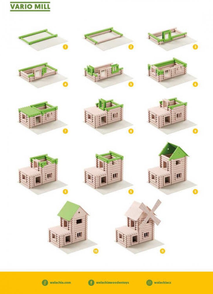 Z této stavebnice postavíte krásný větrný i vodní mlýn. Ale je vhodná i k tomu, abyste z ní postavili více drobných domečků... Ze stavebnice lze postavit asi 12 různých budov.