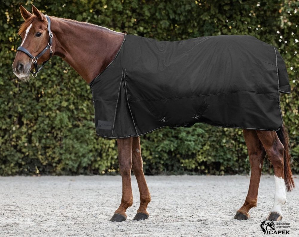 Výběhová deka Waldhausen Nordic se zateplením 200 g. Deka nabízí optimální ochranu i v nepříznivých podmínkách. Má dvojité přední zapínání (Triplex) na přezky se suchým zipem. Prvky s reflexními detaily zvyšují viditelnost za zhoršených světelných podmínek. Rozparek umožňuje neomezenou volnost pohybu. Vybavena je křížovými popruhy pod břichem a nastavitelným popruhem pod ocasem. Popruh je vybavený karabinou, kterou snadno připnete k protilehlému očku. Vnější tkanina s pevností 600 D poskytuje odolnou ochranu proti větru a povětrnostním vlivům. Voděodolná (vodní sloupec 3000 mm). Kompatibilní s "Clip in" systémem (možné dokoupit spodní deky s libovolným zateplením, najdete je ZDE). Deka je dále opatřena D-kroužky pro připevnění krčního dílu. UPOZORNĚNÍ: možnost použití Clip in systému a D-kroužků je od velikosti 115 cm. Praktickým prvkem je vnitřní antibakteriální látka Stay Clean. Tato látka nabízí praktické řešení pro hygienické a snadné zkoušení deky. V případě, že deka sedí, látku jednoduše odstraníte a vyhodíte. Deka je dodávána v praktické tašce na zip.