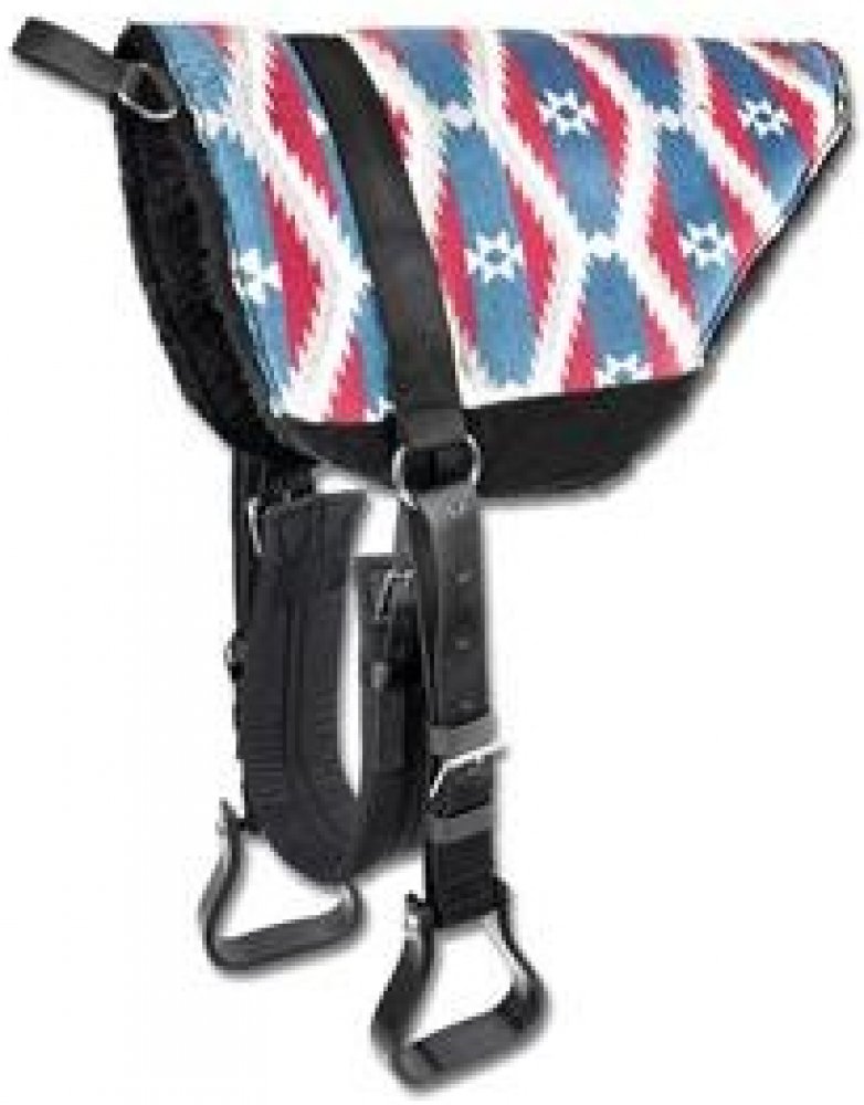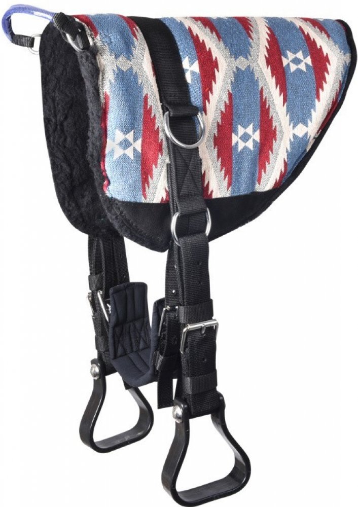 Měkký, polstrovaný jezdecký pad se třmeny westernového typu a podbřišníkem- vysoký komfort pro jezdce a koně- posedlí z odolné tkaniny s vytkávaným vzorem v modro/červené barevné kombinaci, polstrování, spodní část - syntetický beránek- spodní okraje bočnic zvenku zpevněny vsadkou ze syntetické kůže- nastavitelné nylonové třmenové řemeny a plastové westernové třmeny - nášlap cca 12 cm- vpředu popr...