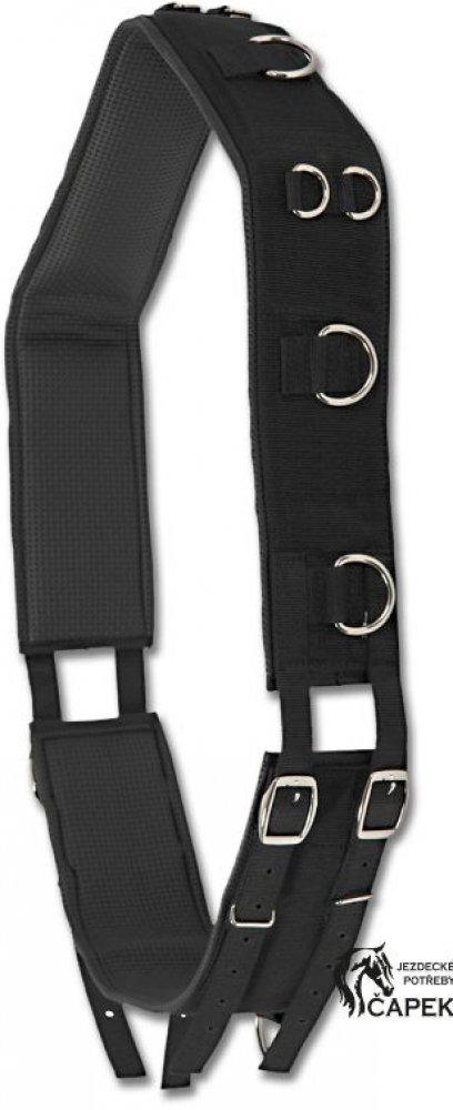 Nylonový lonžovací obřišník podložený měkkou pěnou. 13 kroužků vhodný při lonžování se dvěmi lonžemi umožňuje různé polohy bočních otěží vnitřní polstrování z měkké mřížkové pěny maximální pohodlí pro vašeho koně velikost: PON: nastavitelná od 1,60 - 1,80 m (11 kroužků) ; FULL: nastavitelná od 1,80 - 2,10 m