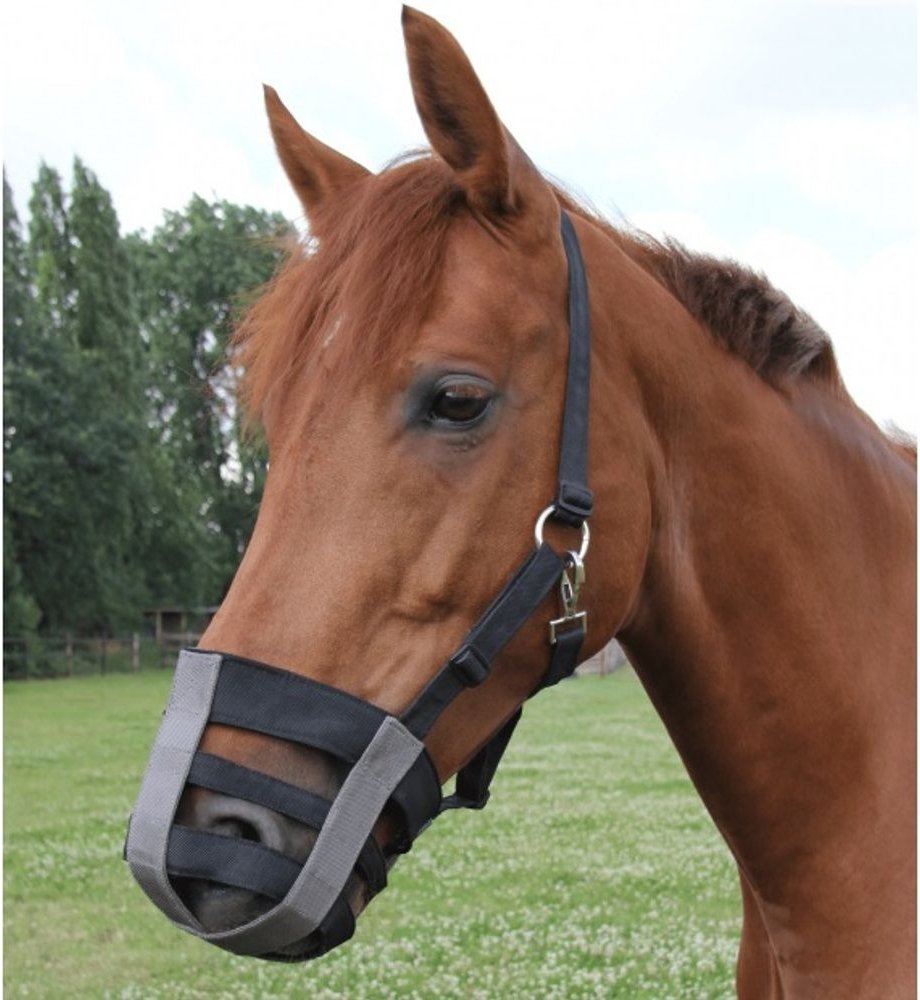 Nastavitelný náhubek pro koně, vyrobený z kvalitního nylonového materiálu. Kůň může bezproblémově dýchat a přitom nemůže žrát. Nejedná se o pastevní náhubek. Velikosti Shetty, Pony, Cob a Full. Barva: černá/šedá.
