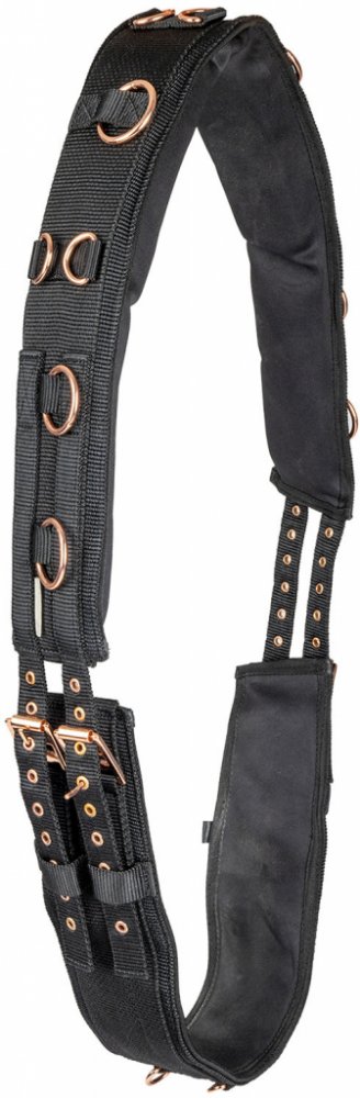Velmi měkký a pro koně komfortní lonžovací obřišník s celkem 12 kroužky, které umožňují lonžovat na dvou lonžích nebo s pomocnými otěžemi. S kováním v barvě rosegold. Včetně podbřišníku.