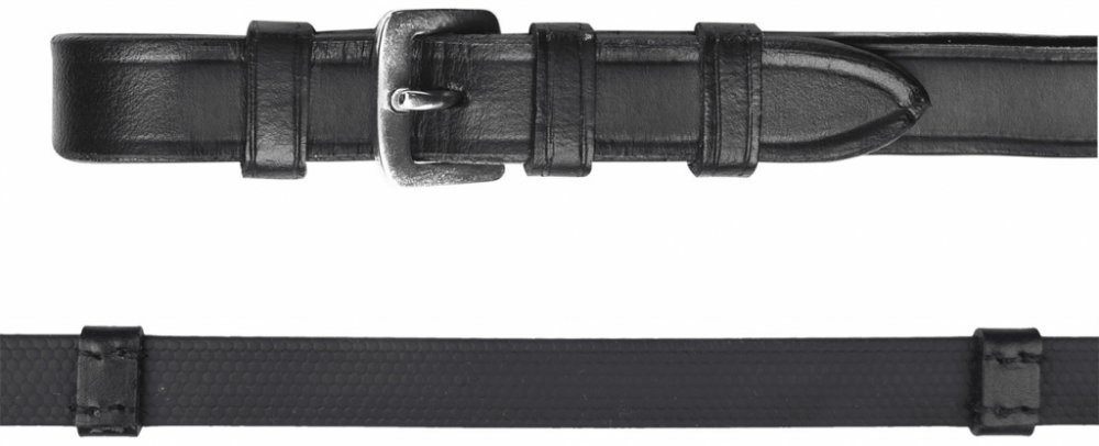 Protiskluzové otěže, které jsou vyrobeny z kombinace gumového a velmi měkkého koženého materiálu. Otěže jsou potaženy gumou podél vnitřní strany. Vybaveny klasickými martingalovými zarážkami a kováním z nerezové oceli. Šířka: 16 mm. K dispozici v černé barvě.