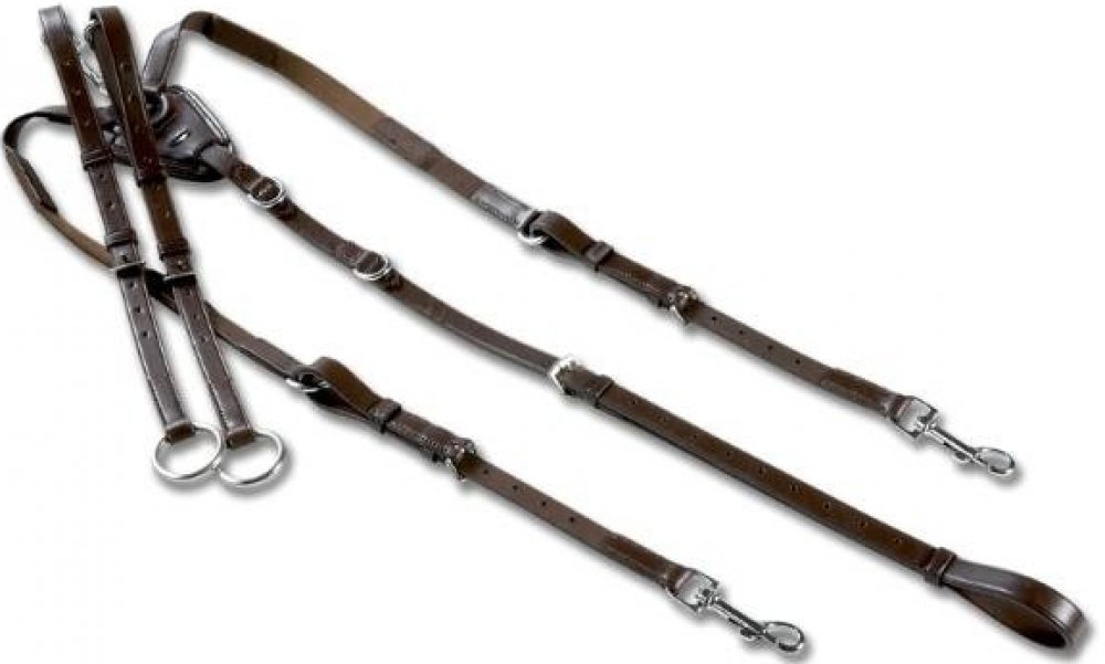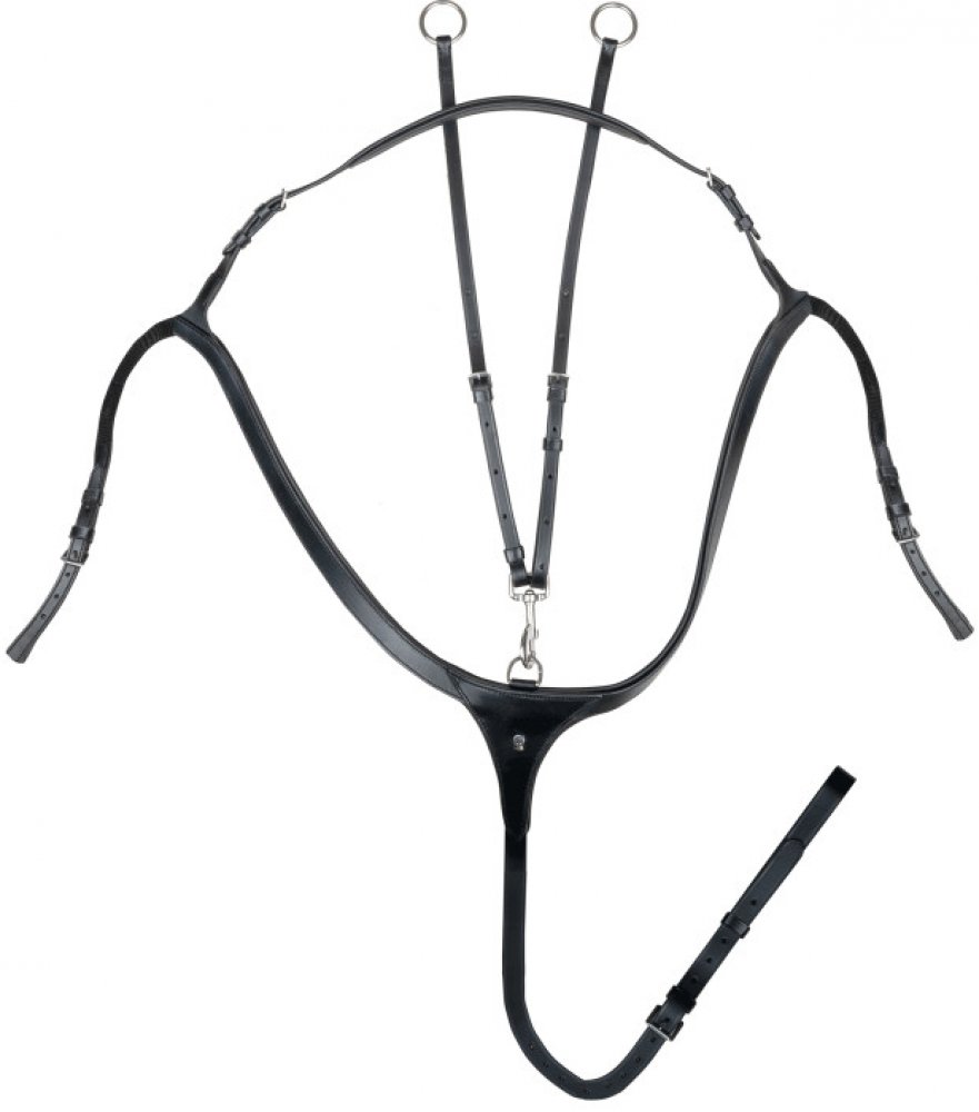 Poprsník se upevňuje ve třech bodech – na podbřišník pomocí nastavitelného koženého řemínku a do strany na zakončení podbřišníku. S odnímatelnou martingalovou vidlicí.