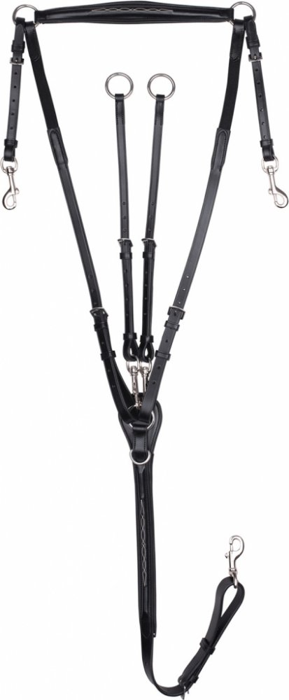 Tříbodový poprsník z kvalitní kůže s odnímatelnou martingalovou vidlicí. Poprsník má anatomický střih, který umožňuje neomezenou volnost pohybu a zároveň brání posuvu sedla. Část, která se provléká podbřišníkem je nastavitelná. Má kvalitní kování z nerezové oceli a elastické vložky pro vysoký komfort. Poprsník z řady X-line kombinuje stabilitu a pohodlí.