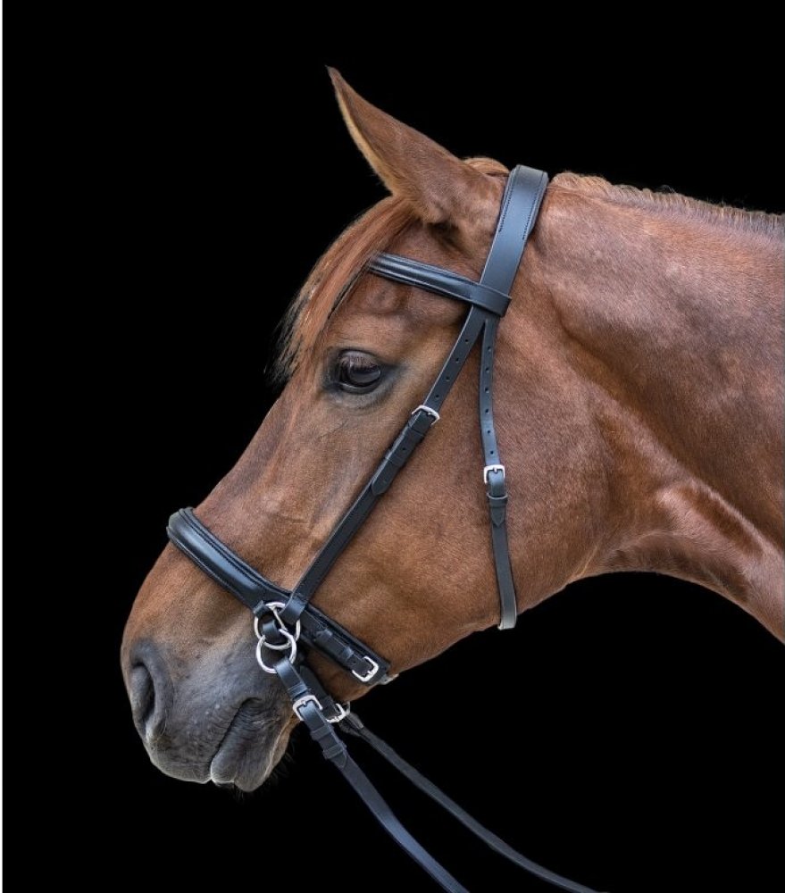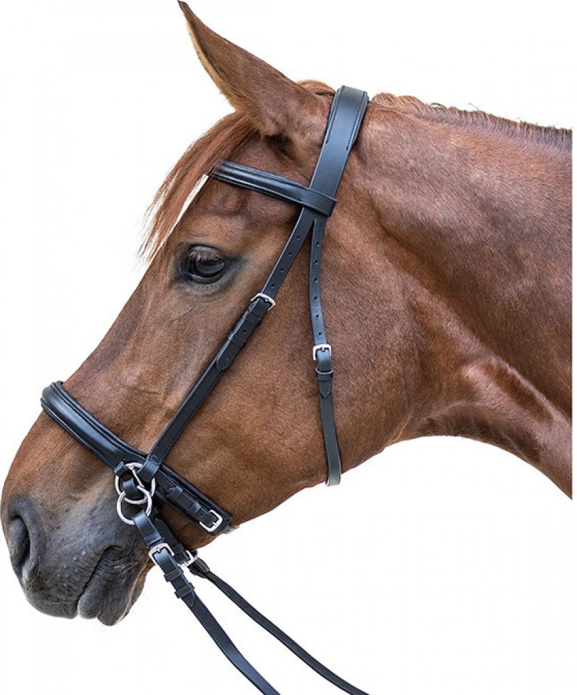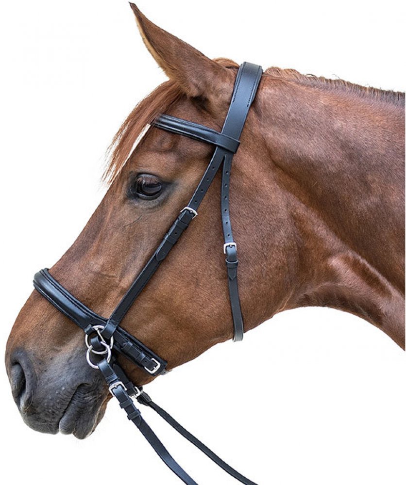 Uzdečka bez udidla, efekt Scawbrig. Měkce polstrovaný nánosník a krční řemínky. Vítaná změna pro dobře vycvičeného koně.