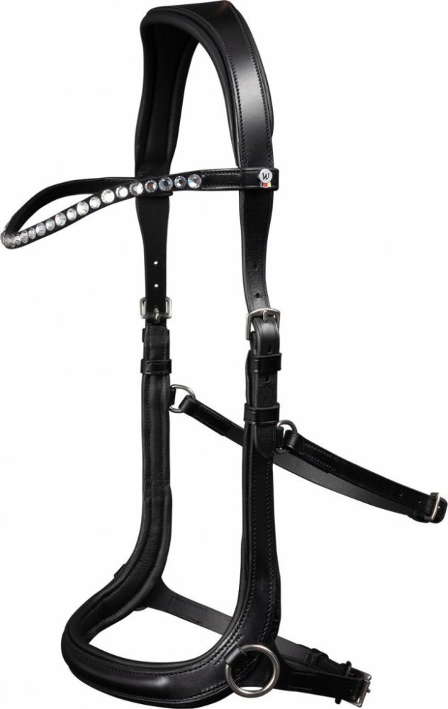 Bezudidlová uzdečka z prémiové řady X-Line od výrobce Waldhausen. S dvěma kroužky na nánosníku pro přichycení otěží. Anatomicky tvarovaný nátylník a nánosník, uzdečka tak dobře rozkládá tlak. Se zahnutou čelenkou s kamínky. Dodáváno včetně otěží.