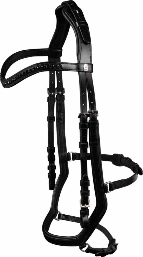 Vysoce kvalitní uzdečka S-line se zajímavým elegantním střihem. Má anglický kombinovaný nánosník a nátylník zajišťující dostatečnou volnost uší, který má extra měkké polstrování. Uzdečka je zdobena zakřivenou čelenkou s měkkým polstrováním se stříbrnými kamínky uprostřed a vybavená kováním z nerezové oceli. Dodávána s 19 mm širokými otěžemi.