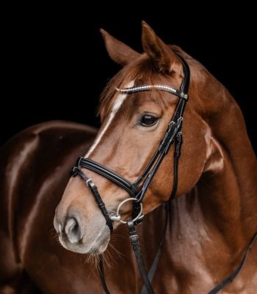 Vysoce kvalitní uzdečka z řady S-line v zajímavém vzhledu. Uzdečka má anglický kombinovaný nánosník a anatomický nátylník zajišťující dostatečnou volnost pro uši. Nánosník i čelenka jsou vybaveny měkkým polstrováním. Součástí uzdečky jsou dvě čelenky - klasická kožená čelenka bez zdobení nebo kožená čelenka zdobena stříbrnými kamínky. Čelenky můžete měnit dle svého uvážení. Veškeré kování je z kva...