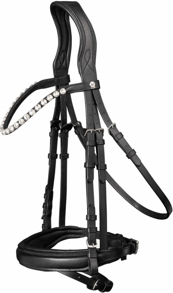 VÝPRODEJ: Vypadnutý kamínek na čelence. Elegantní a velmi kvalitní kožená uzdečka s anglickým kombinovaným nánosníkem. Má zakřivenou čelenku zdobenou kamínky a anatomicky tvarovaný nátylník. Čelenka a nánosník mají extra měkké polstrování. Kování je z nerezové oceli. Dodávána v setu s 19 mm širokými otěžemi. K dispozici v černém provedení.