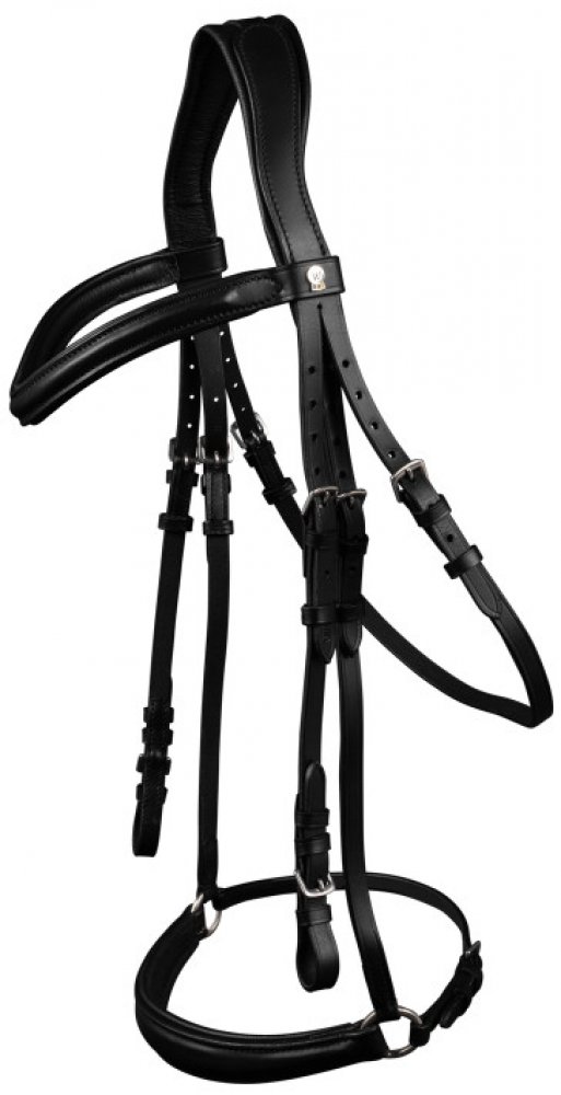 Velmi kvalitní kožená uzdečka s hannoverským nánosníkem. Má zakřivenou čelenku v jednoduchém provedení a anatomicky tvarovaný nátýlník. Čelenka, nánosník i nátylník mají extra měkké polstrování. Uzdečka má kvalitní kování z nerezové oceli