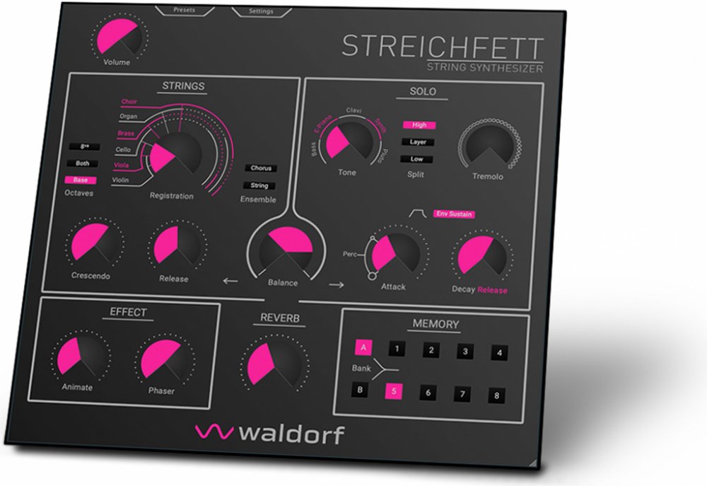 je virtuální instrument věrně emulující hardwarový předobraz Waldorf Steichfett. Zvukově je zaměřený na legendární string syntetizéry 70. a 80. let, které se nesmazatelně zvukově otiskly do nespočtu populárních nahrávek. Zvukový engine hardwaru Waldorf Streichfett je nyní k dispozici jako plug-in pro vaše DAW. K dispozici tak máte plný, jasný zvuk pro podklady a zvukové výplně za velmi přijatelnou cenu. Plug-in podporuje všechny běžné formáty (VST3, VST2, AU, AAX).