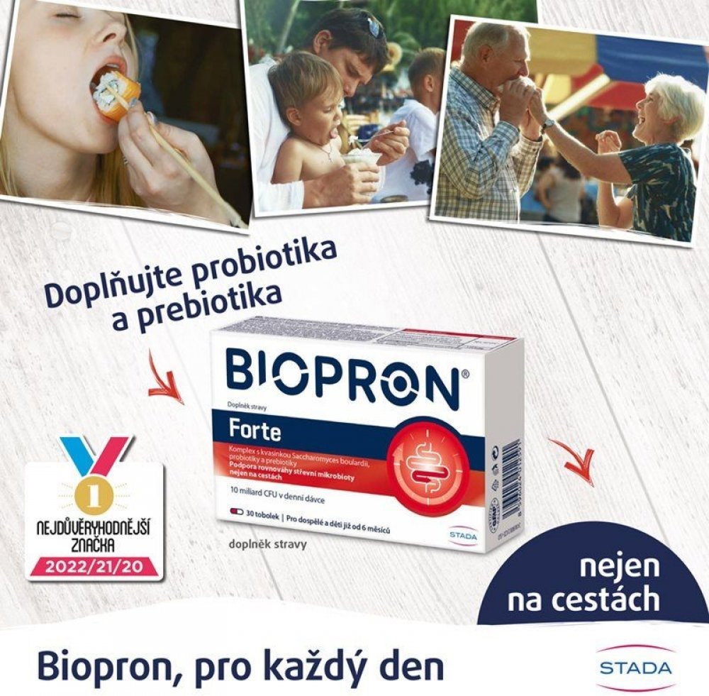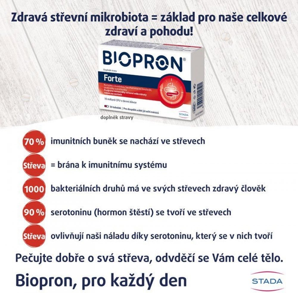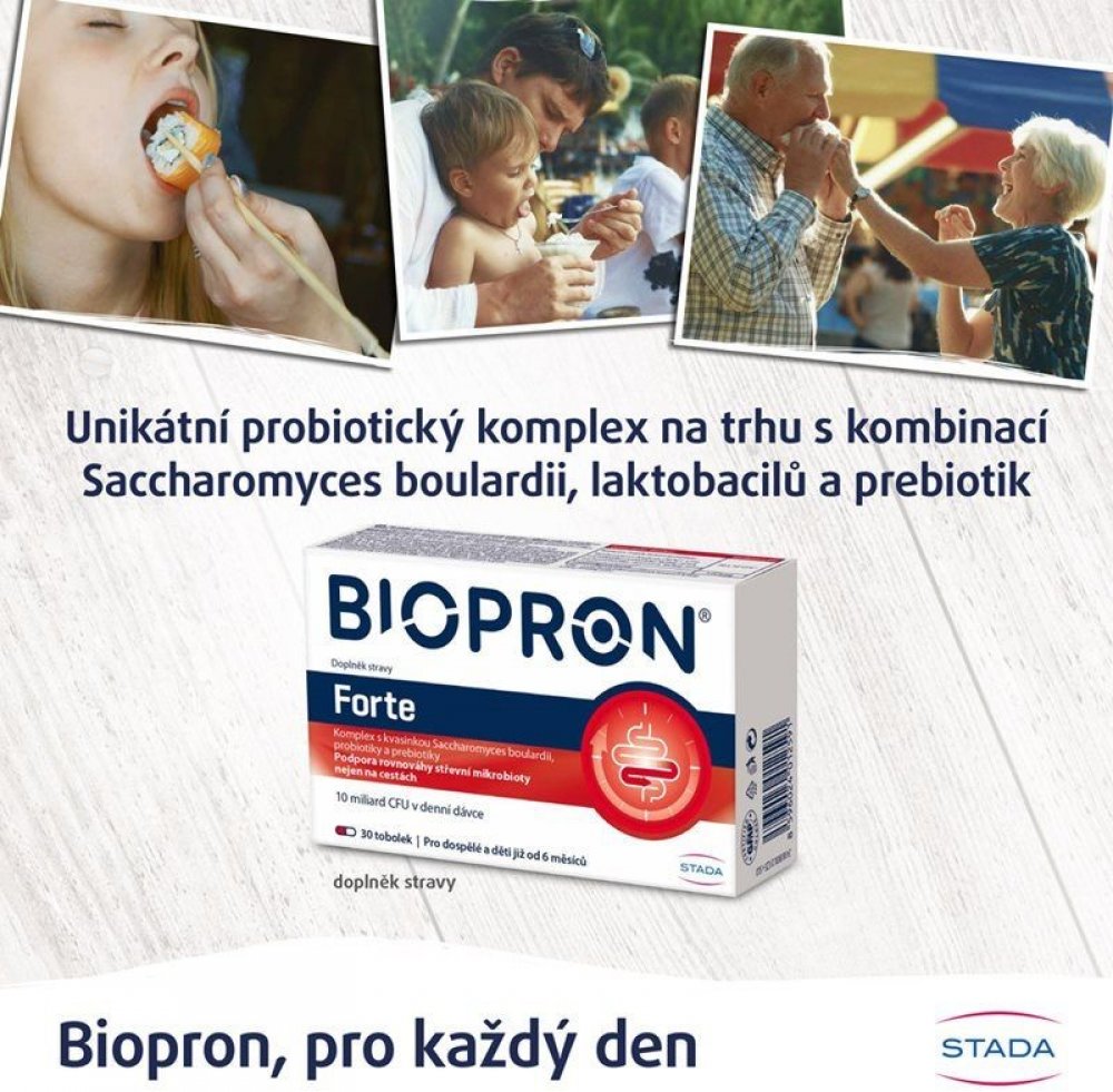 Biopron FORTE je komplex probiotických bakterií (Lactobacillus acidophilus, Lactobacillus rhamnosus) a probiotických kvasinek Saccharomyces boulardii s vysokou klinicky ověřenou účinností při akutních průjmech různého původu.